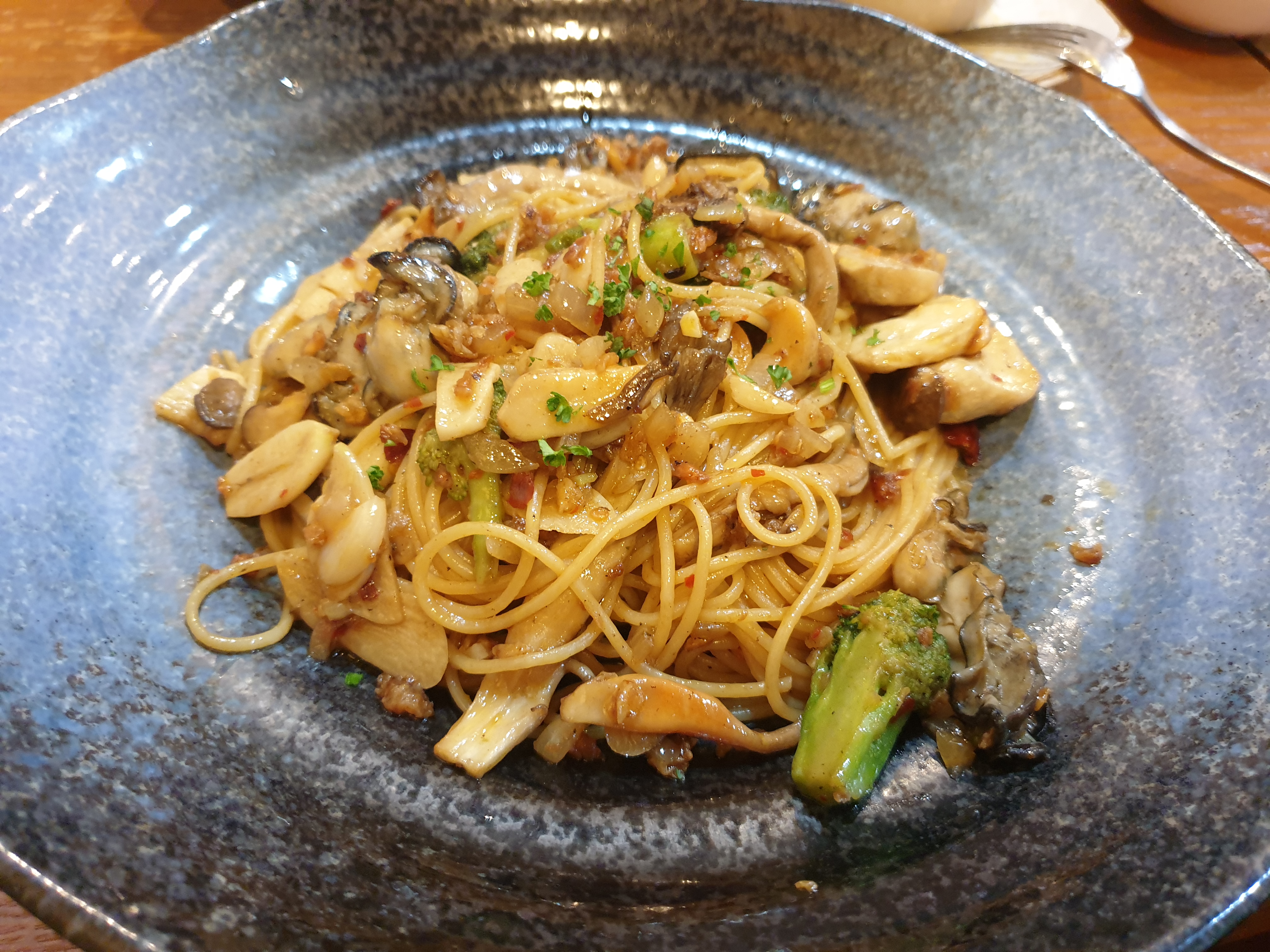 알리오 올리오에 굴 소스와 굴을 넣은 것 같습니다.