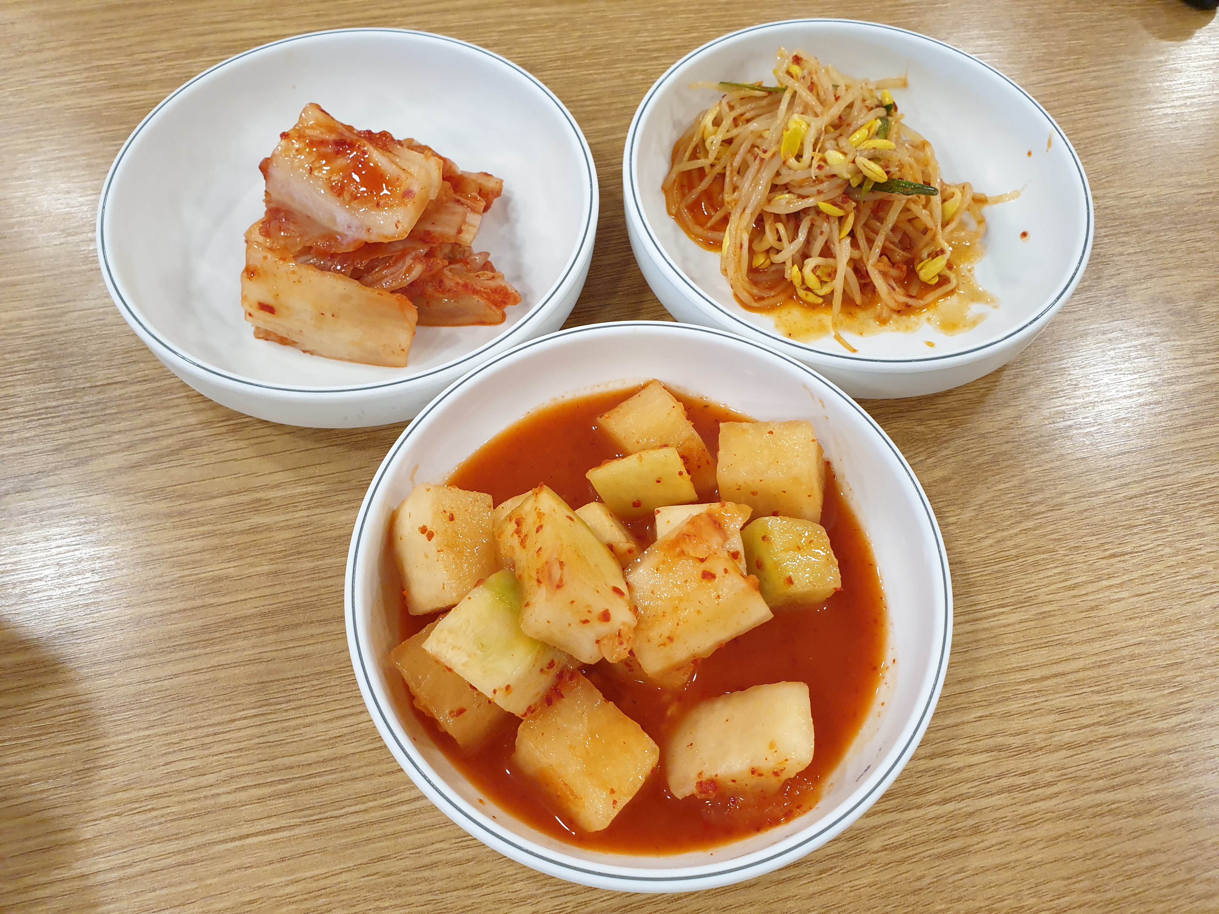 김치, 깍두기, 콩나물 무침.