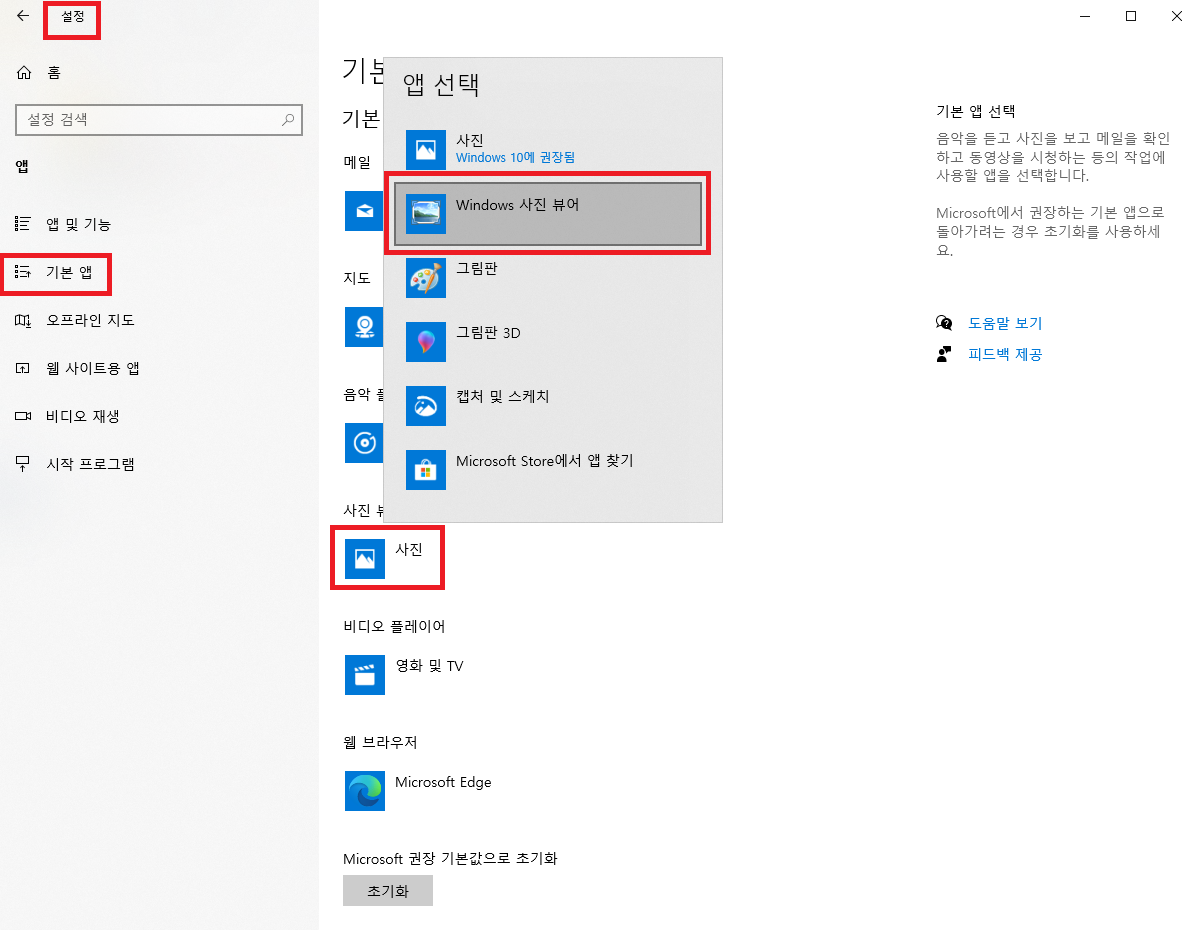 다음 경로로 이동하셔서 사진 뷰어의 기본 앱을 'Windows 사진 뷰어' 로 변경 합니다.