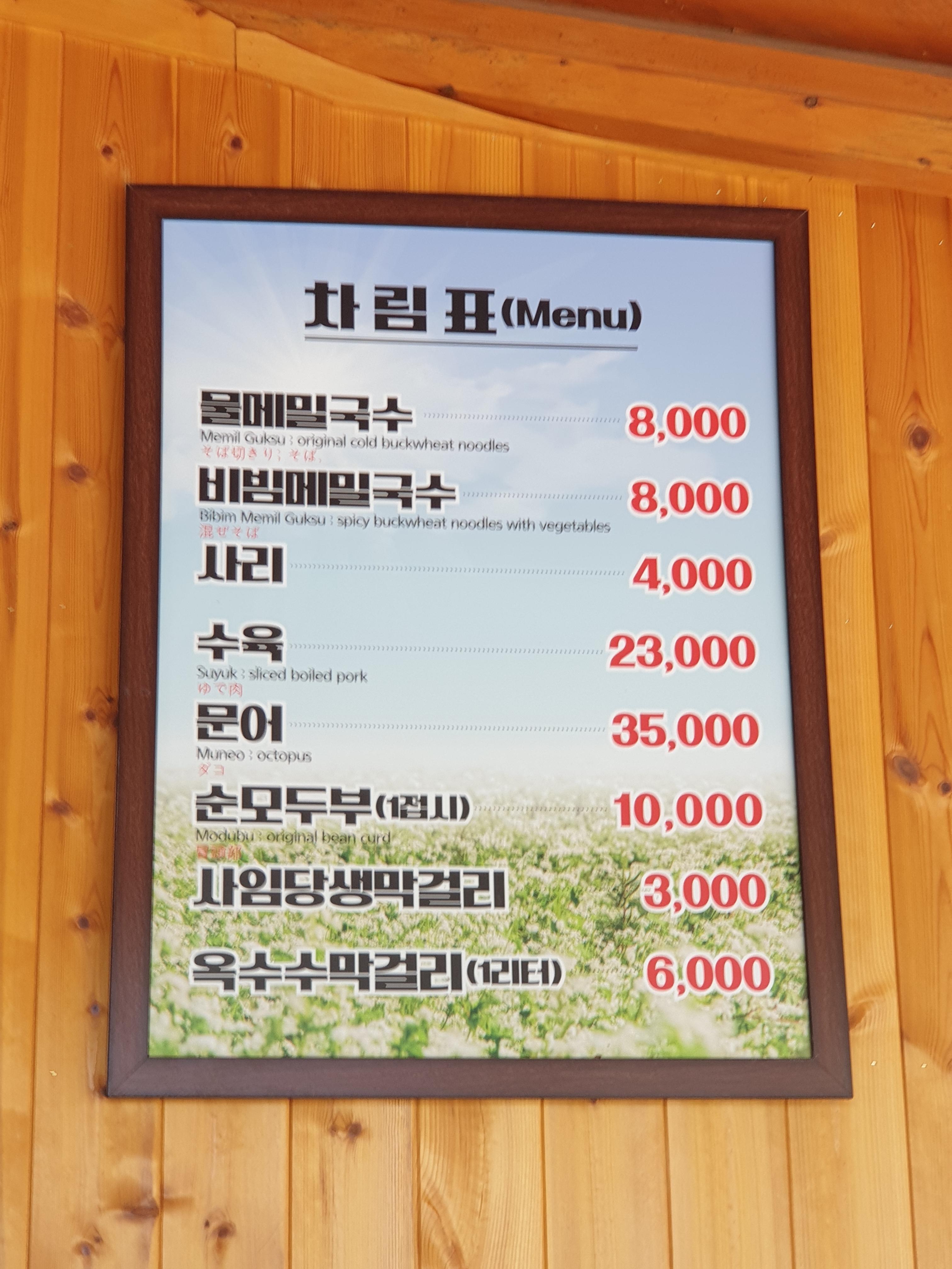 메뉴는 5가지 (물막국수, 비빔막국수, 수육, 문어, 두부) 입니다.