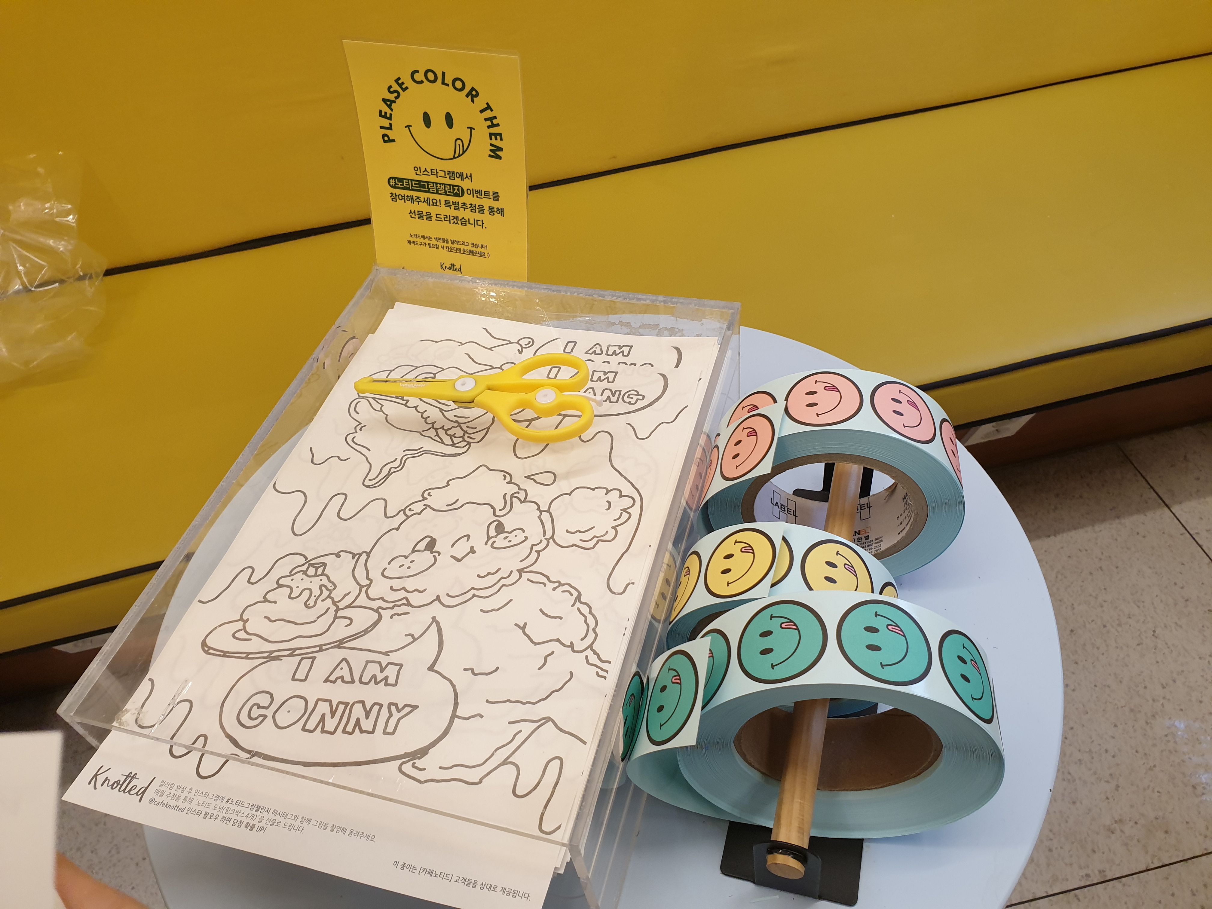 카페 컨셉인지 색칠공부와 스마일 스티커를 자유롭게 가져갈 수 있게 되어있네요.