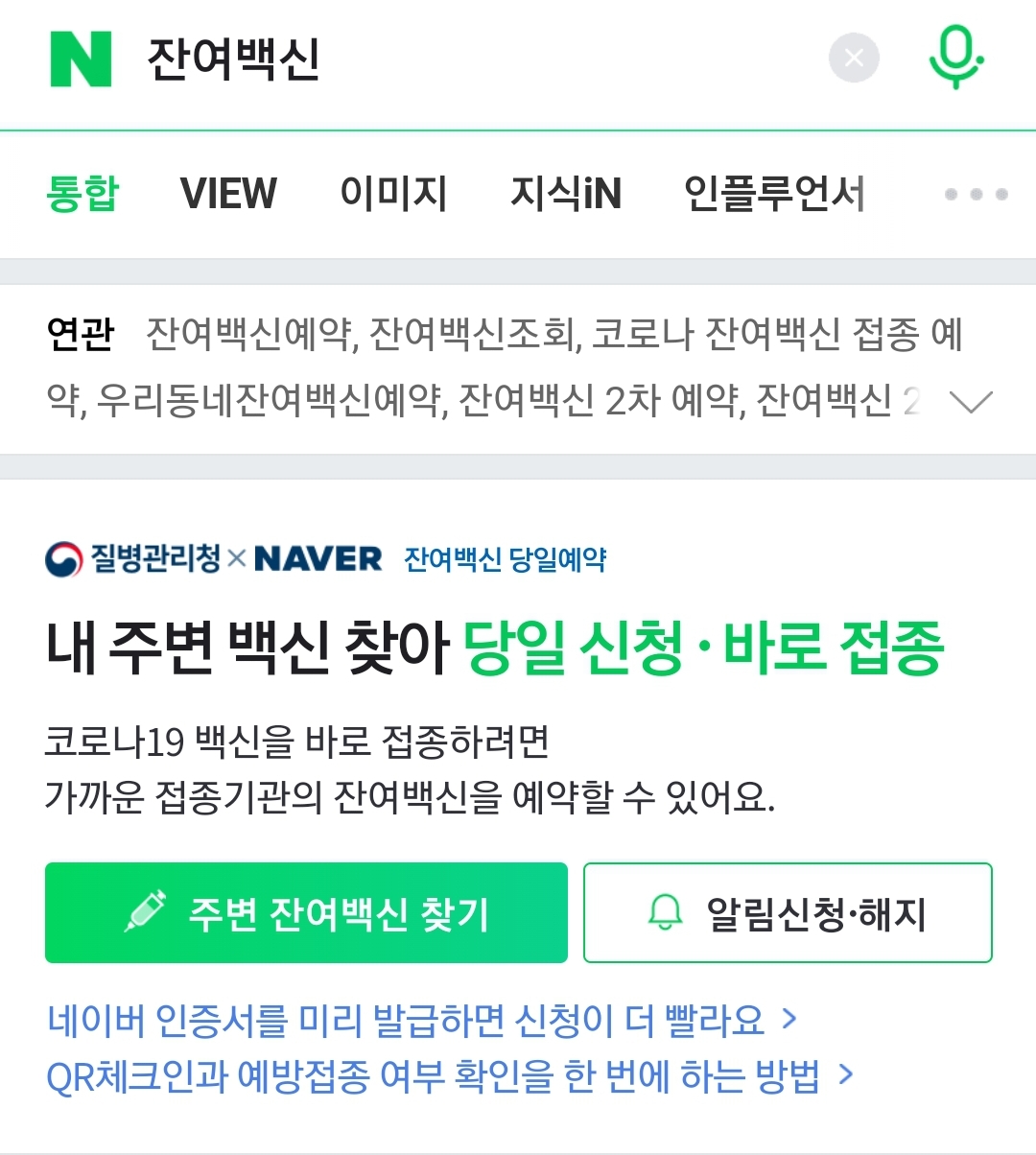 접종 당일 아침 잔여백신을 검색해봤습니다. (네이버)