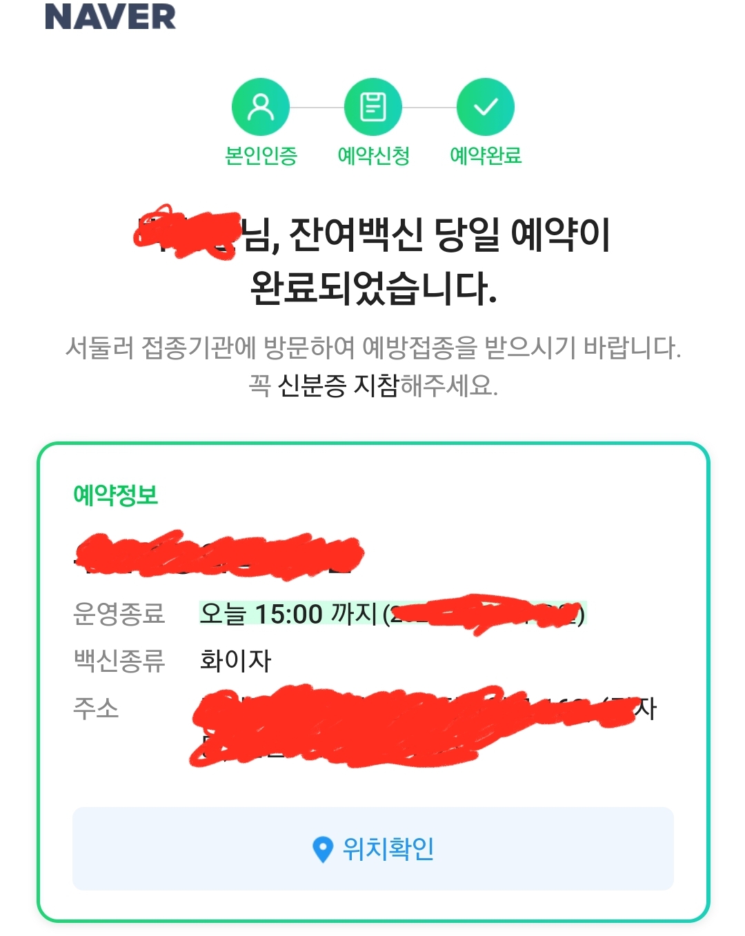 잔여 백신 화이자로 예약을 완료 하였습니다.