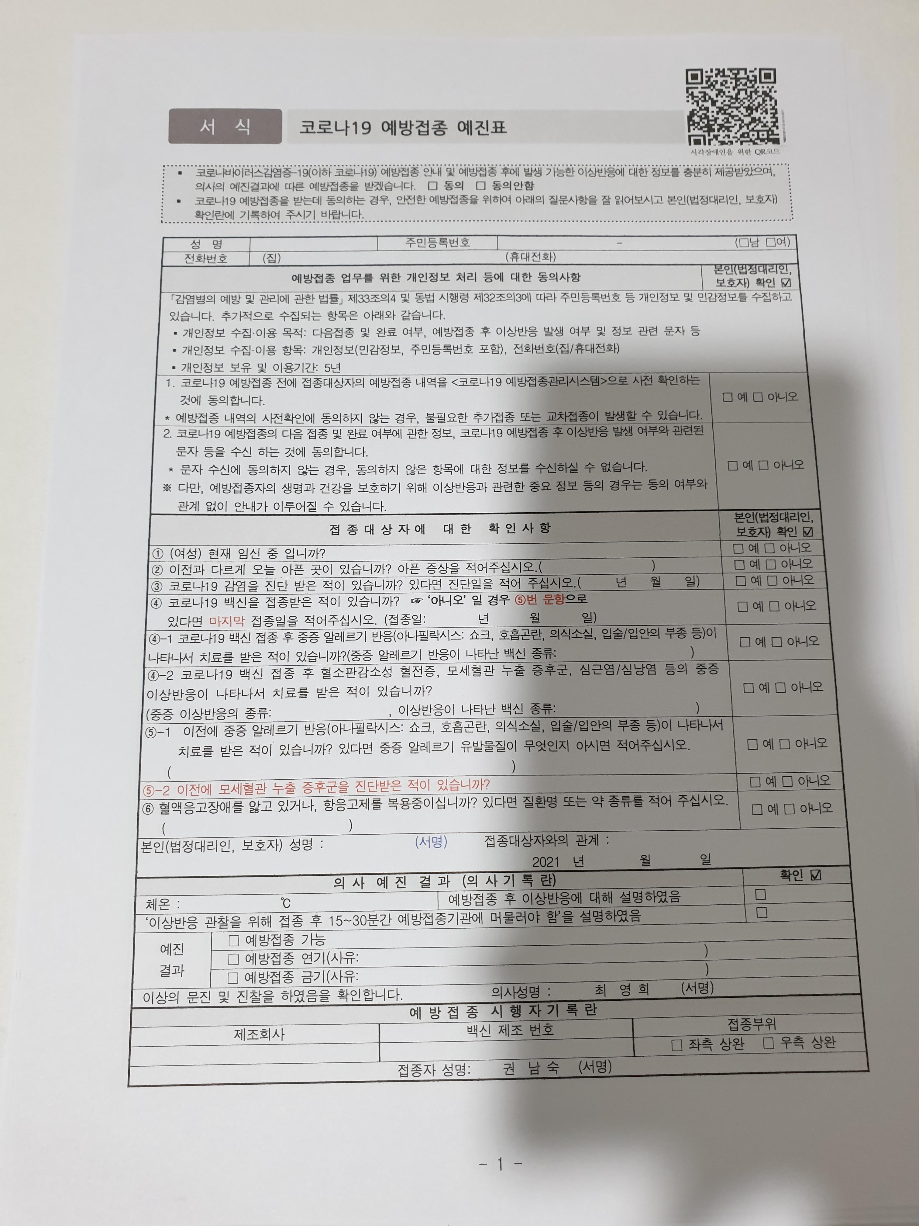 저번과는 다르게 접종 이력에 "예" 를 선택하고 접종일을 기입했습니다.