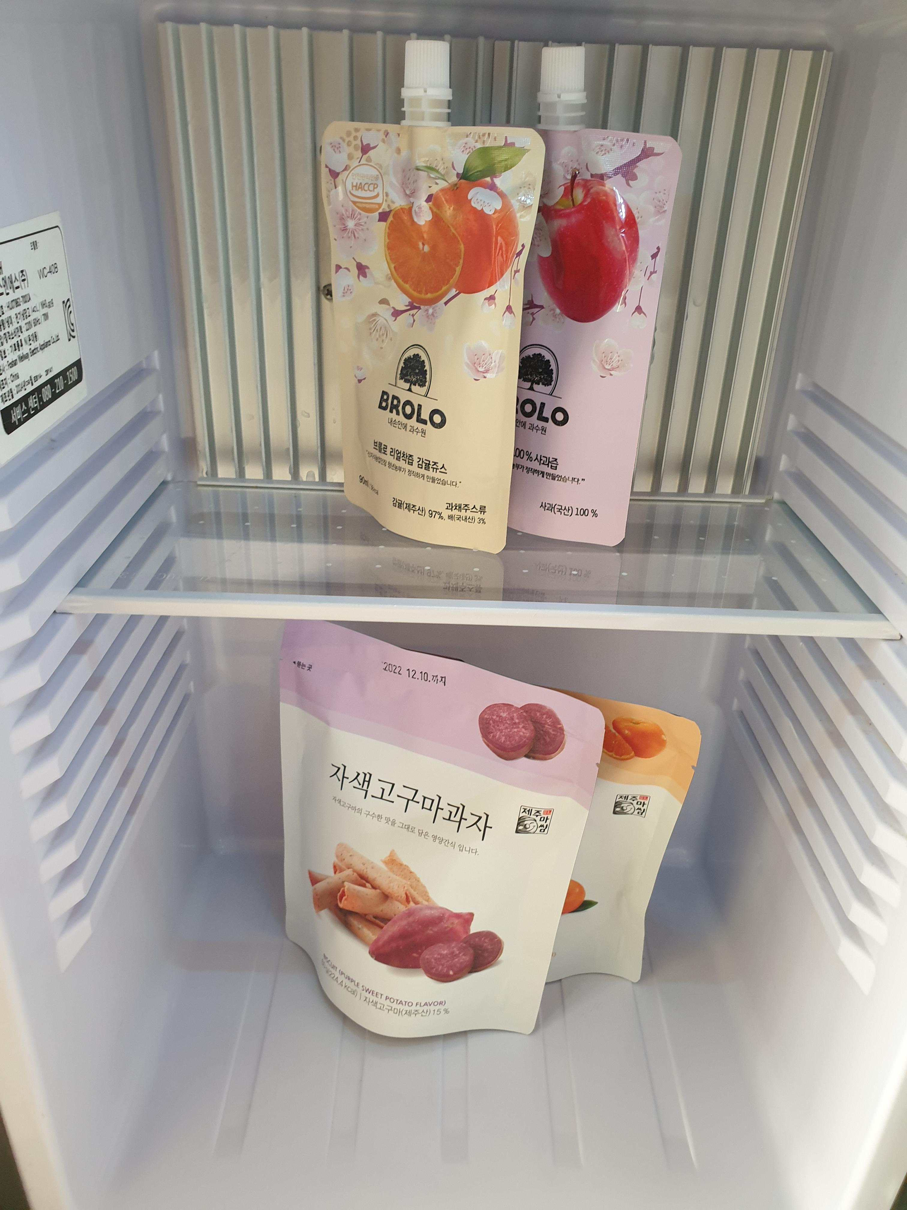 냉장고에 있는 물과 사과즙, 감귤즙, 스낵은 무료 이용이고
