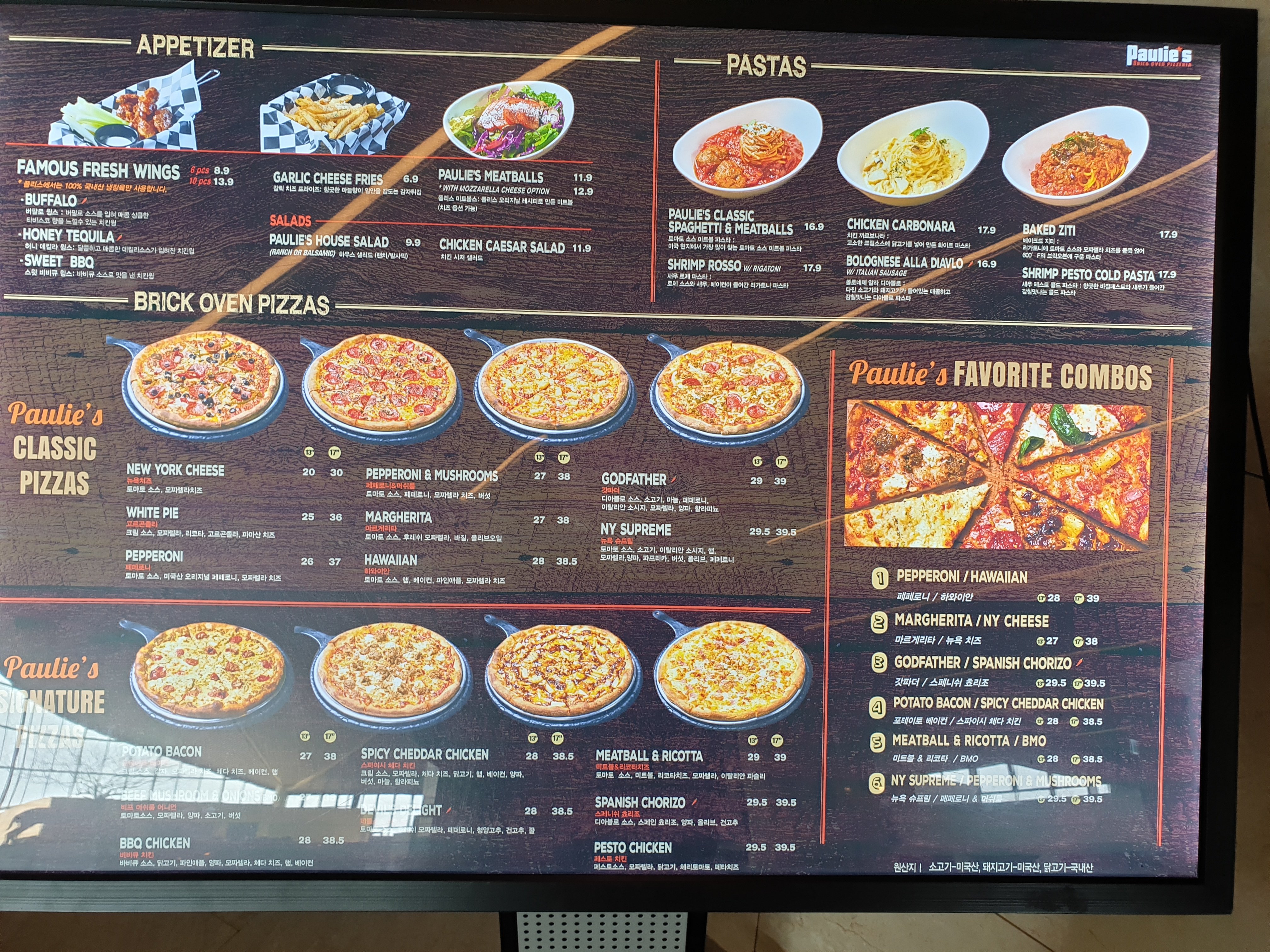 메뉴판이나.. 실제 피자의 비쥬얼은 엄청 짠 미국피자일 거라 생각했는데...