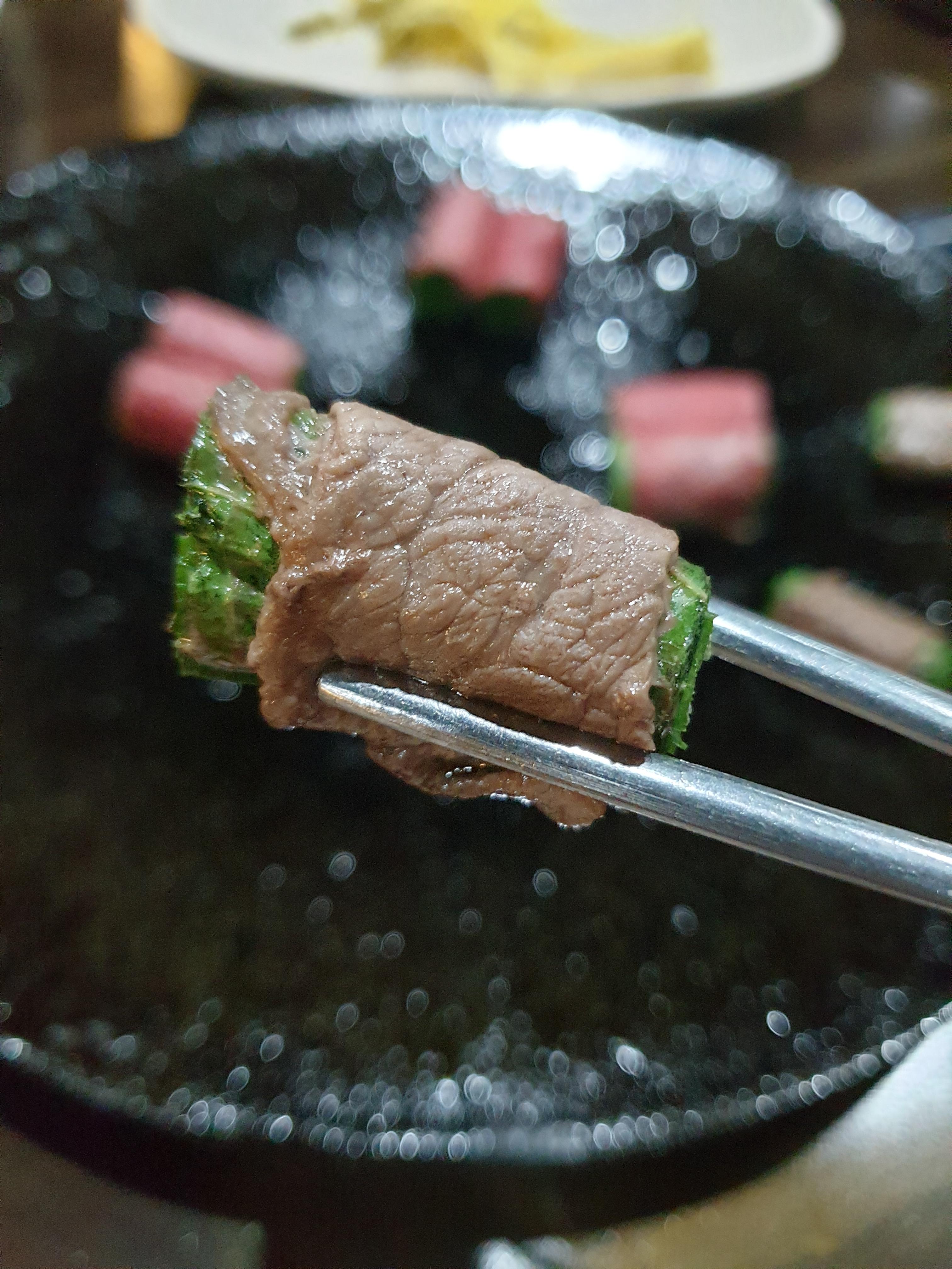 깻잎과 부추를 얇은 소고기로 말아놓은 메뉴에요.