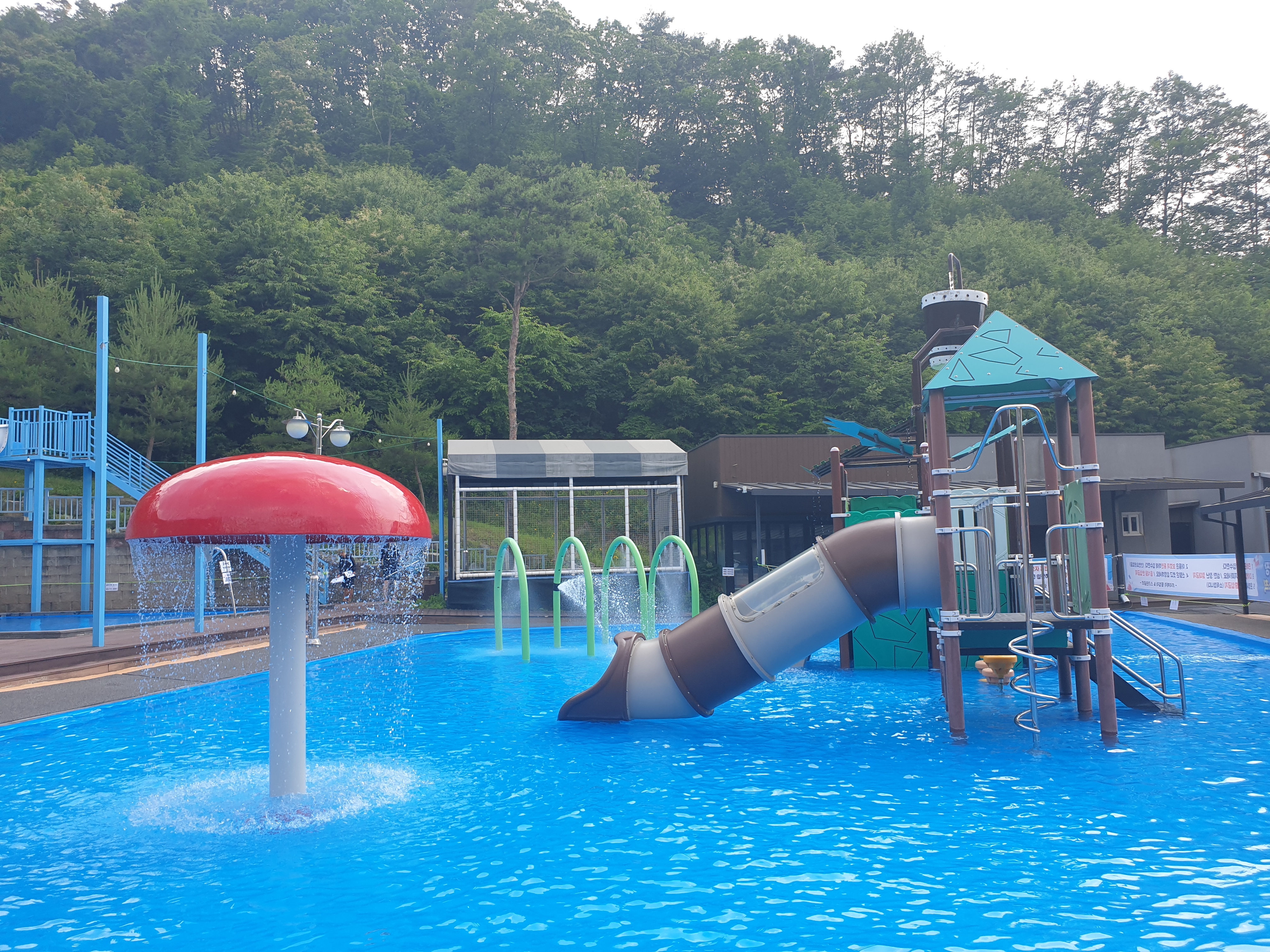 어른 발목 정도 오는 깊이에 일반 물놀이 놀이터 느낌의 놀이터가 있습니다.