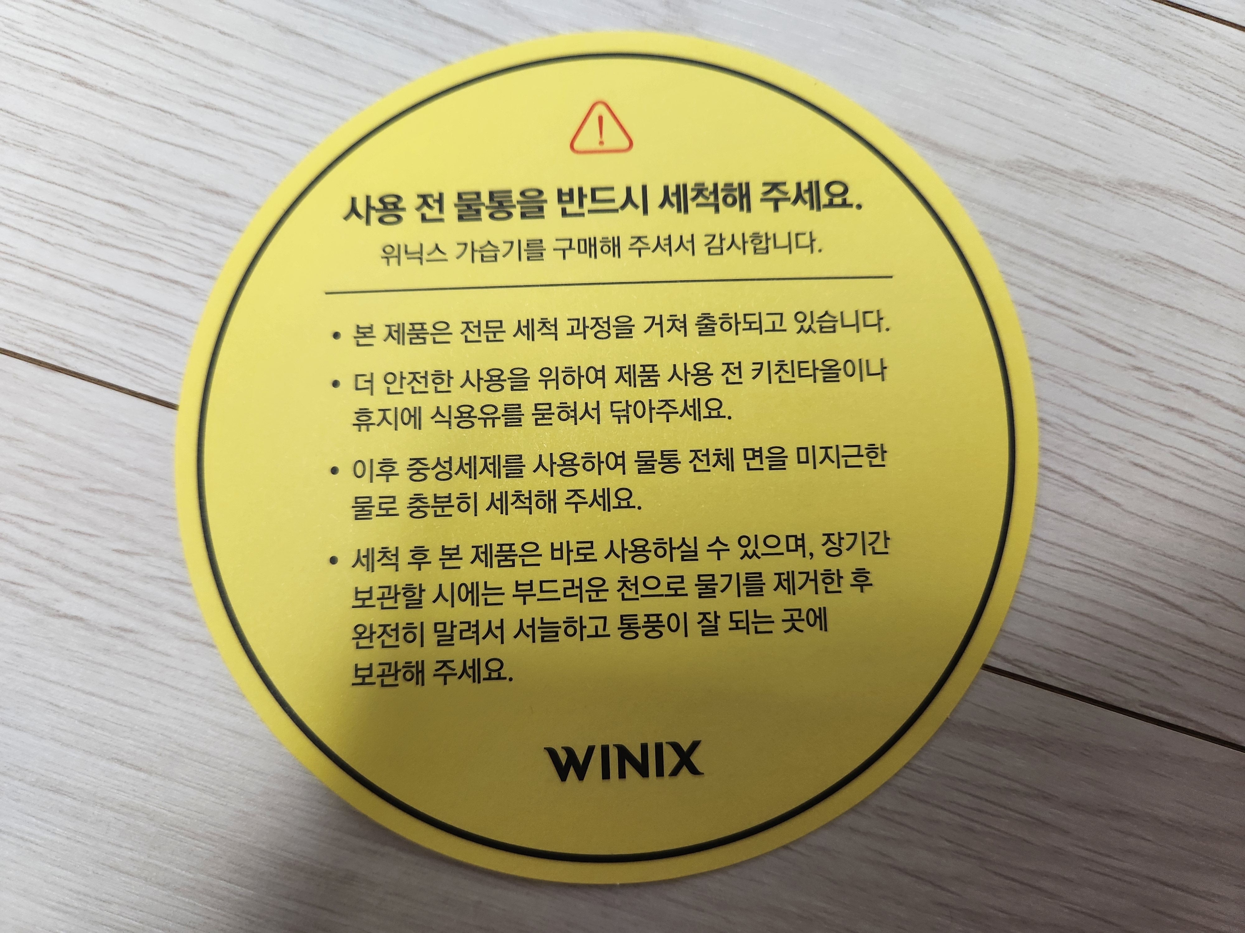 물통이 스테인레스라 연마제 제거를 위해 식용유로 닦아주라는 안내문이 들어있습니다.