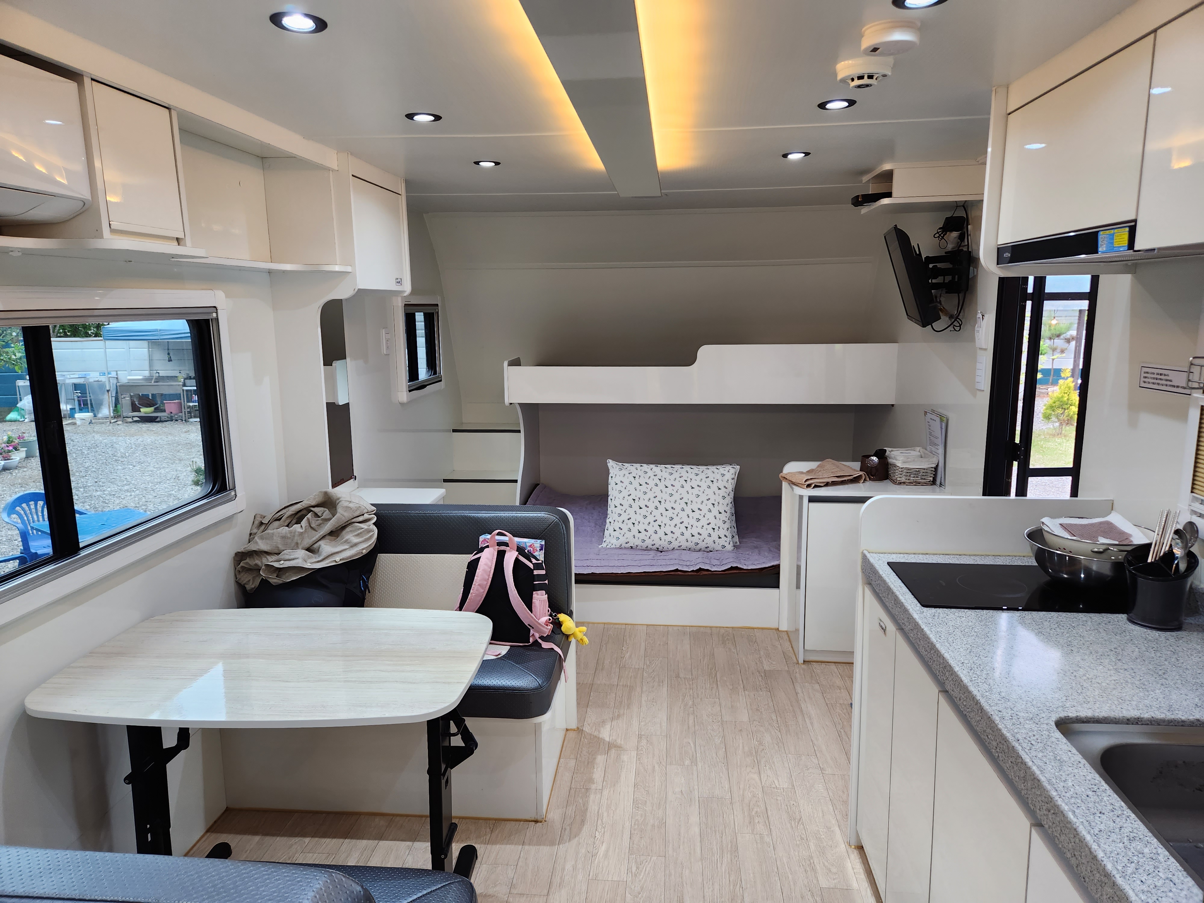 욕조가 있는 카라반은 2층 침대가 있습니다.