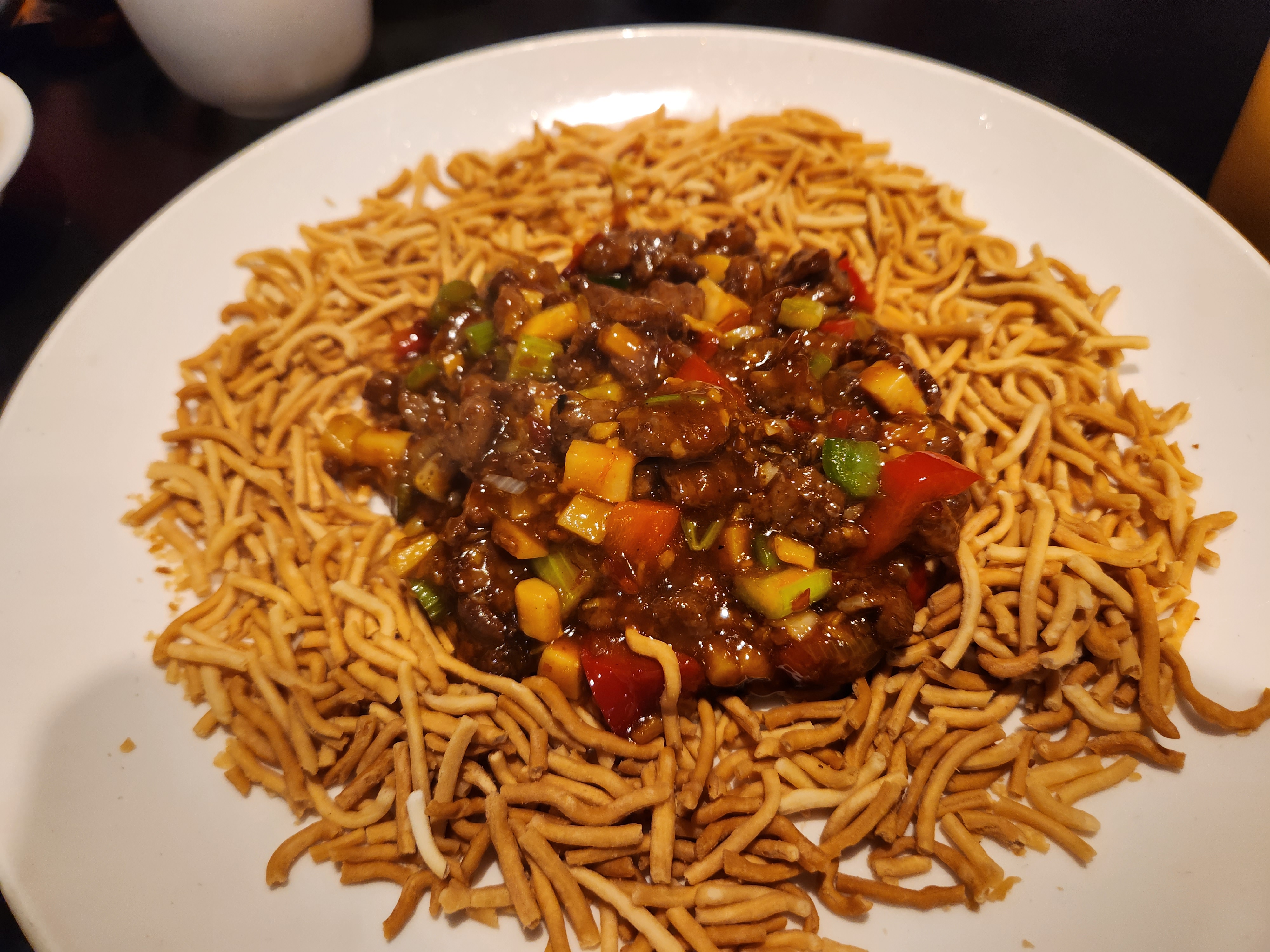 생 양상추에 소고기 볶음과 면 튀김을 싸먹는 요리 입니다.