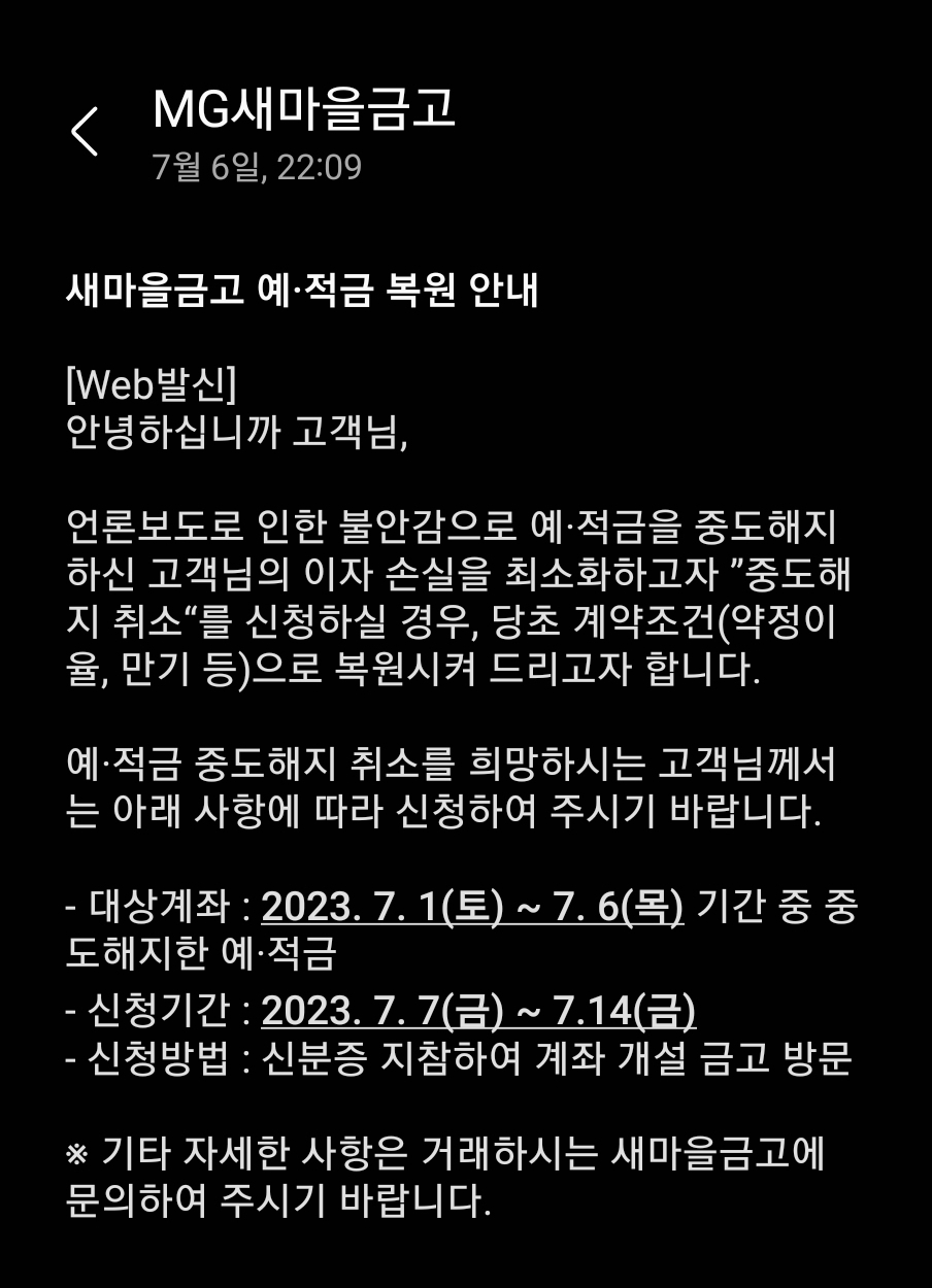 - 대상계좌 : 2023. 7. 1(토) ~ 7. 6(목) 기간 중 중도해지한 예·적금