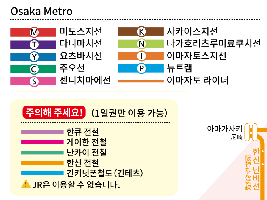 1일권은 오사카 지하철 이외 사철들도 이용이 가능합니다.