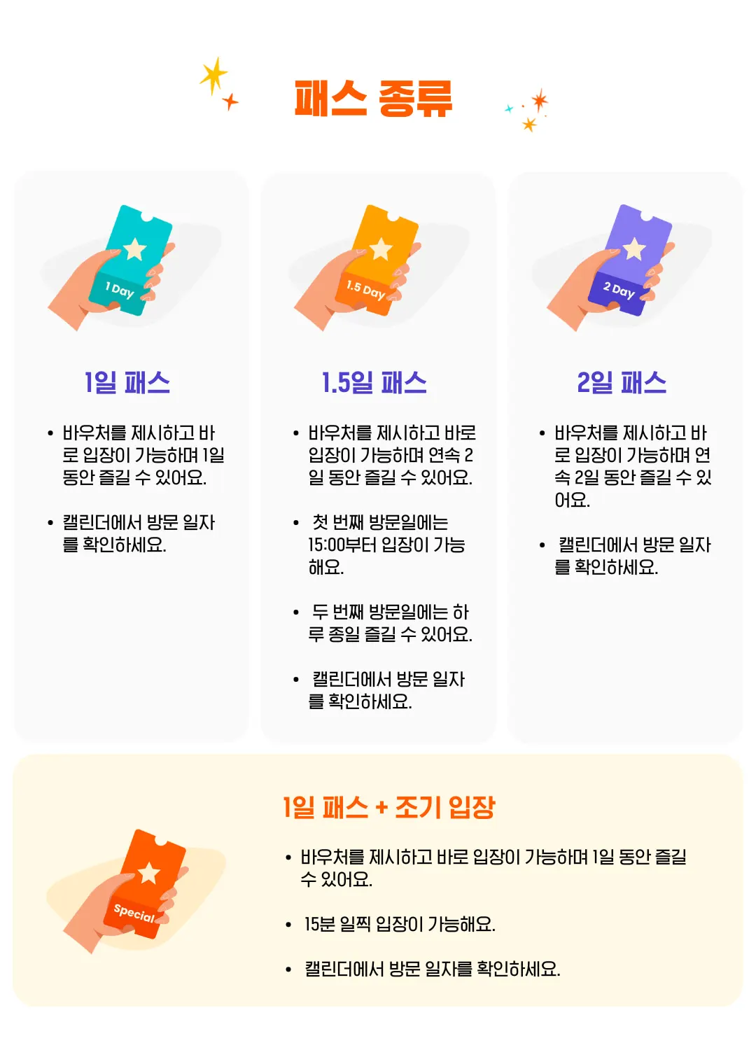 - 1.5일권 : 첫째날엔 15시 이후 입장, 다음날엔 종일 입장