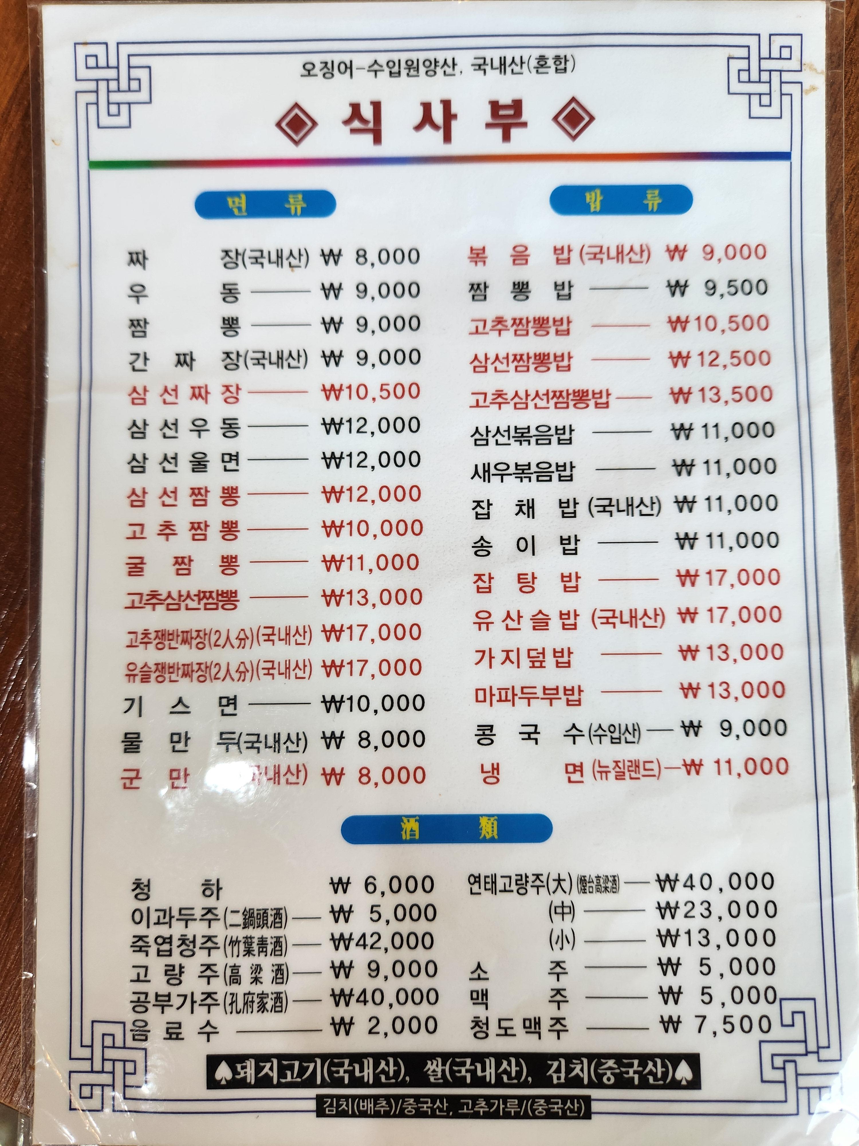 오래된 중국집 느낌이 확 드는 메뉴판 입니다.