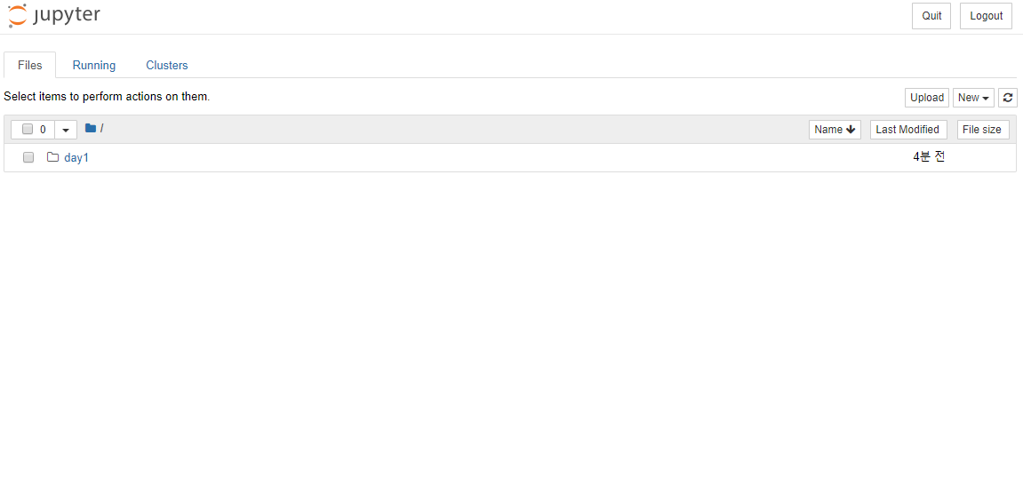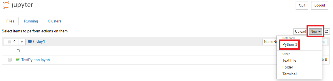 원하는 디렉토리 경로에서 New -> Python2/Python3 를 클릭 하면 파이썬 코드 파일 생성이 가능합니다.
