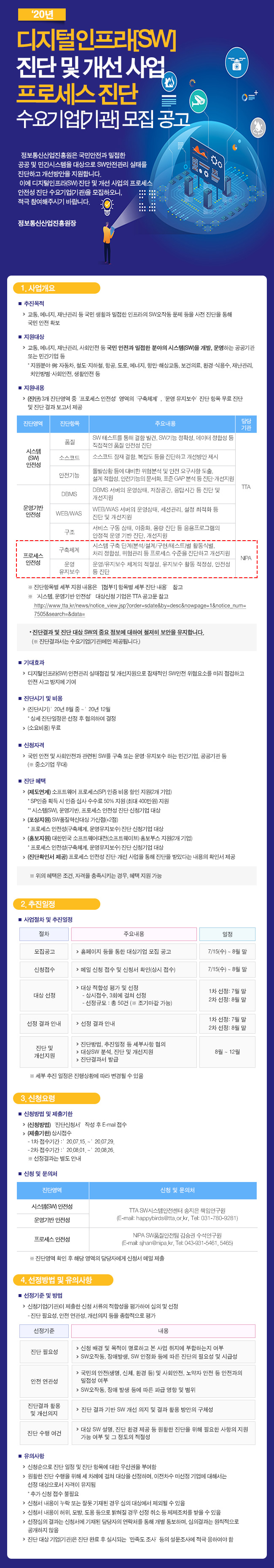 정보통신산업진흥원은 국민안전과 밀접한 공공 및 민간시스템을 대상으로 SW안전관리 실태를 진단하고 개선방안을 지원합니다. 이에 디지털인프라(SW) 진단 및 개선 사업의 프로세스 안전성 진�