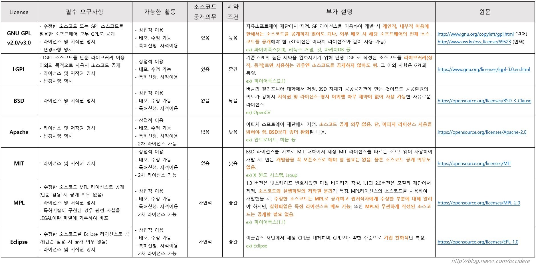 아래는 GPL, LGPL, BSD, Apache, MIT, MPL, Eclipse 라이센스의 내용들을 간단히 요약한 것으로 좀더 자세한 내용을 원한다면 링크를 참조하자.