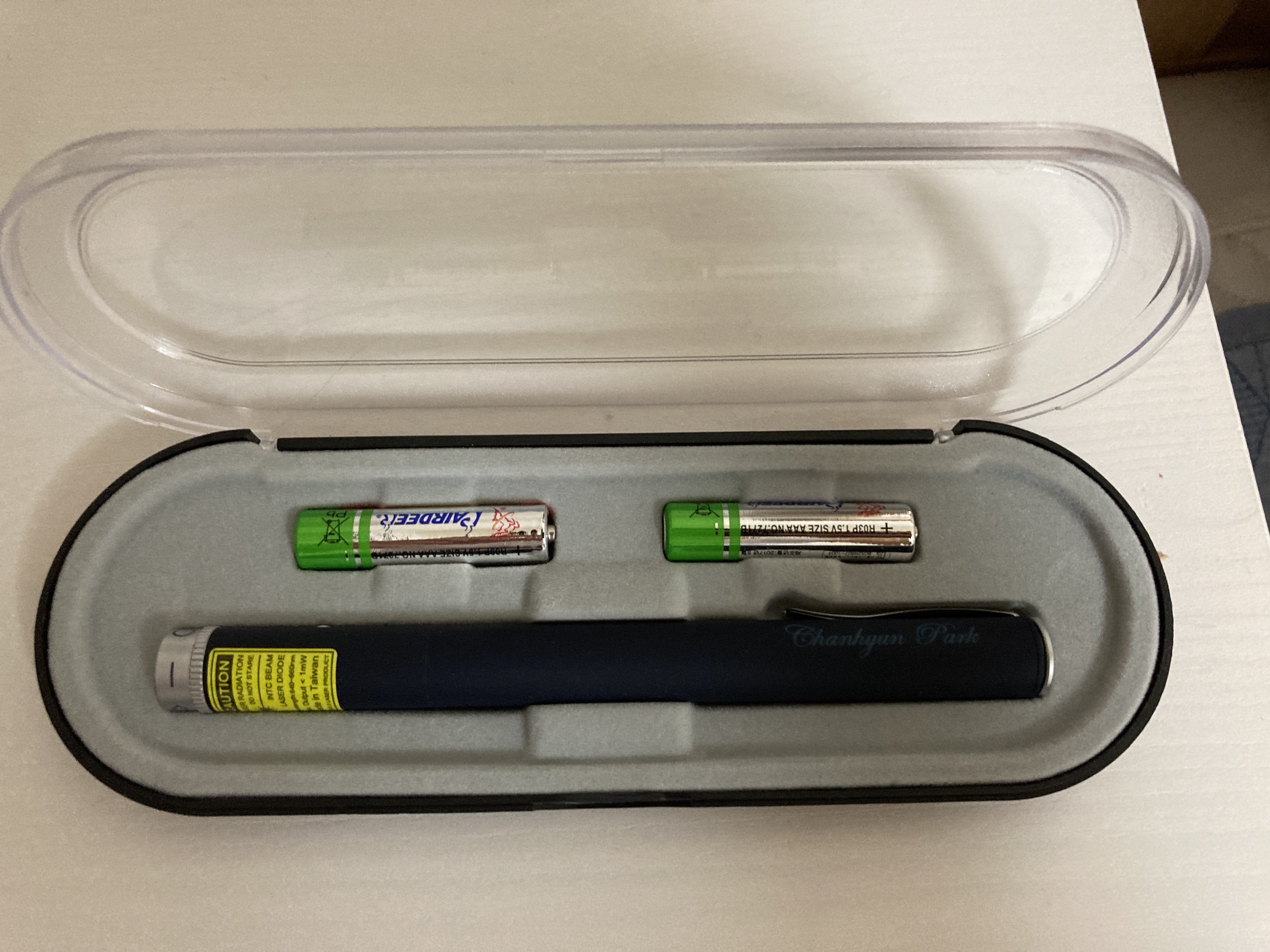 안전을 위해 새로운 레이저 포인터를 구매 하였습니다.