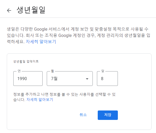 구글 계정에 생년월일이 입력이 안되있으면 위와 같은 화면이 뜹니다.