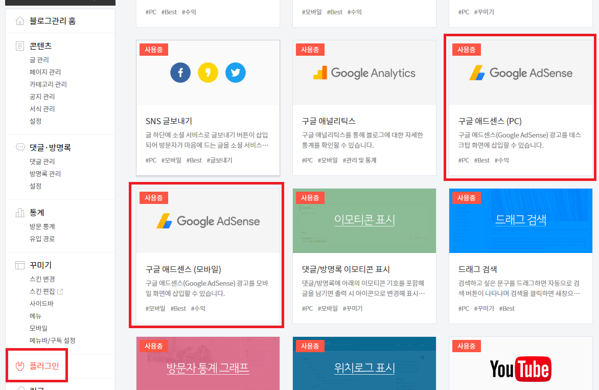 만약 '반응형 스킨' 을 사용하신다면 '구글 애드센스 (반응형)' 플러그인만 사용하셔도 됩니다.