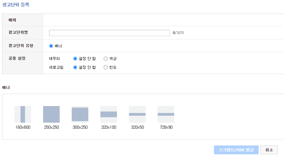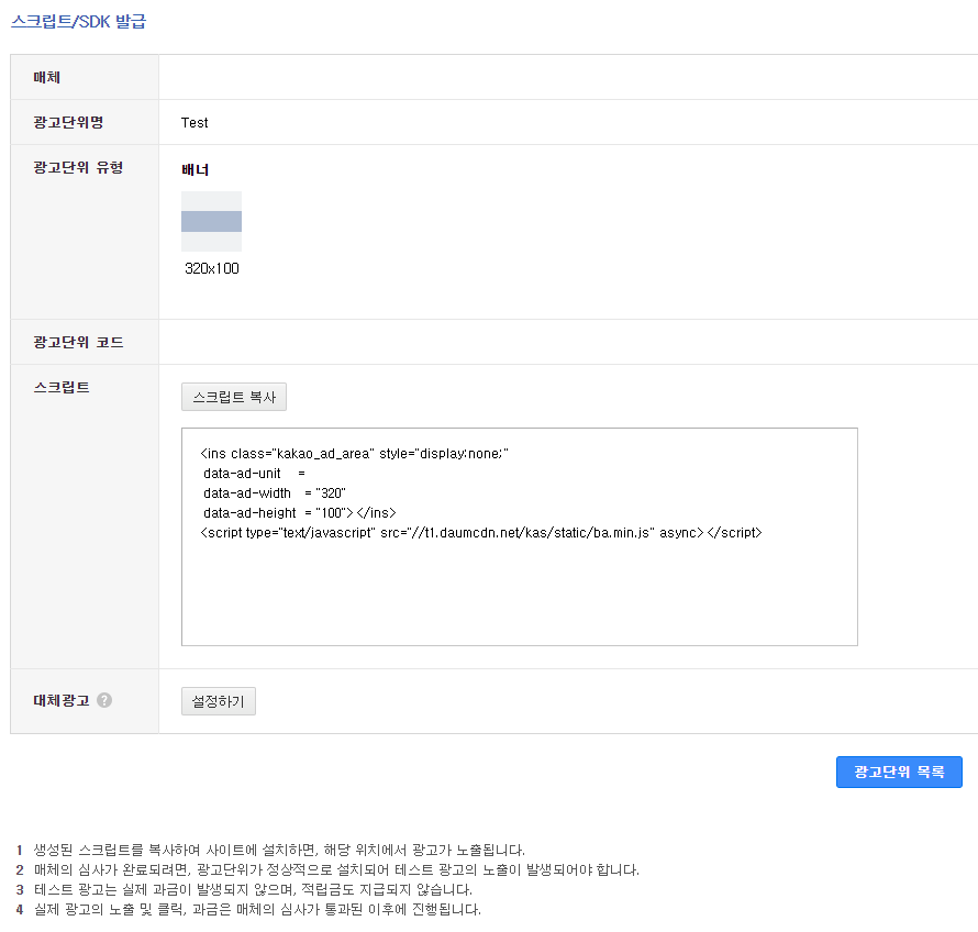 광고 단위 코드는 '스크립트' 버튼을 눌러 띄워줄 수 있습니다.