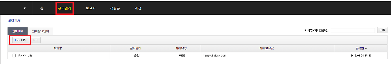광고 관리 -> 전체 매체 -> 새 매체 로 이동하여 사이트를 추가해 줍니다.