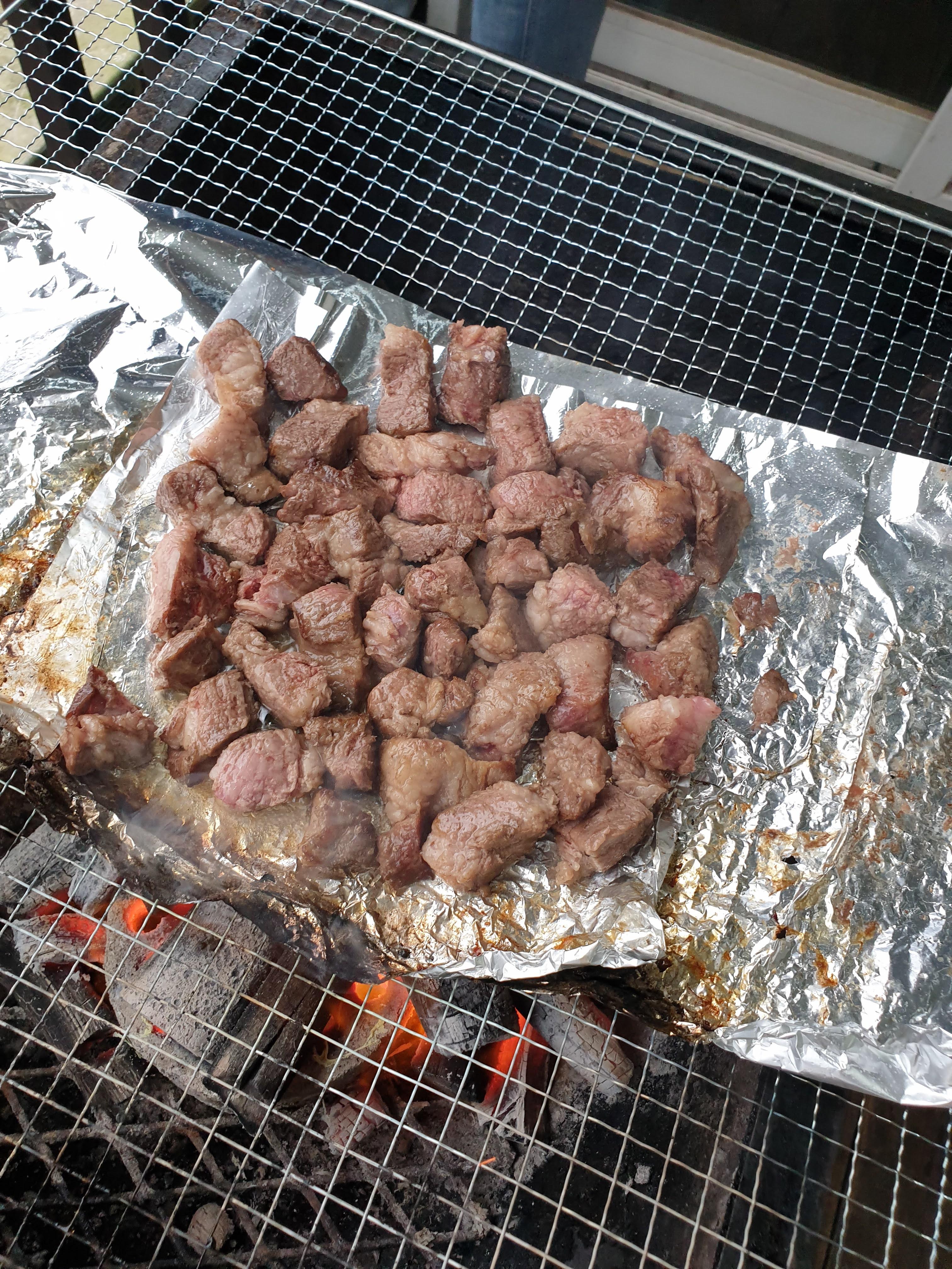 기름이 충분히 녹을 때 까지 호일 위에서 초벌을 해줍니다.