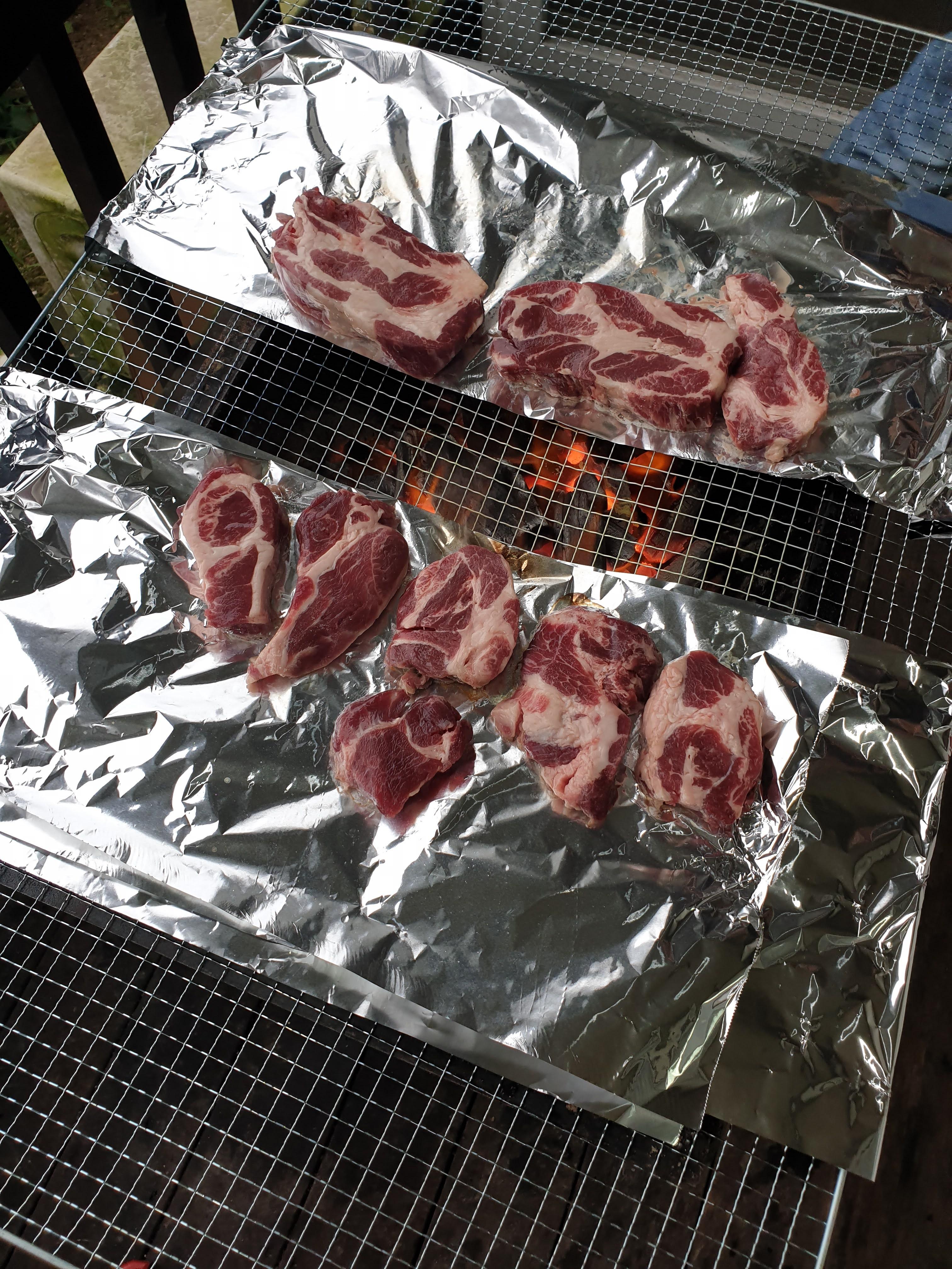 위쪽에서 초벌하고 있는 목살은 얼핏 보면 소고기 스테이크 같습니다.