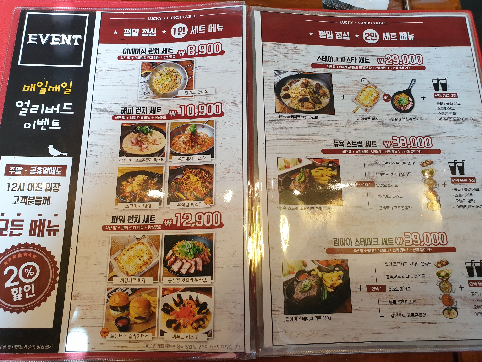 평일 점심엔 세트 메뉴로 저렴하게 스테이크와 파스타/샐러드 를 세트로 즐길 수 있습니다.