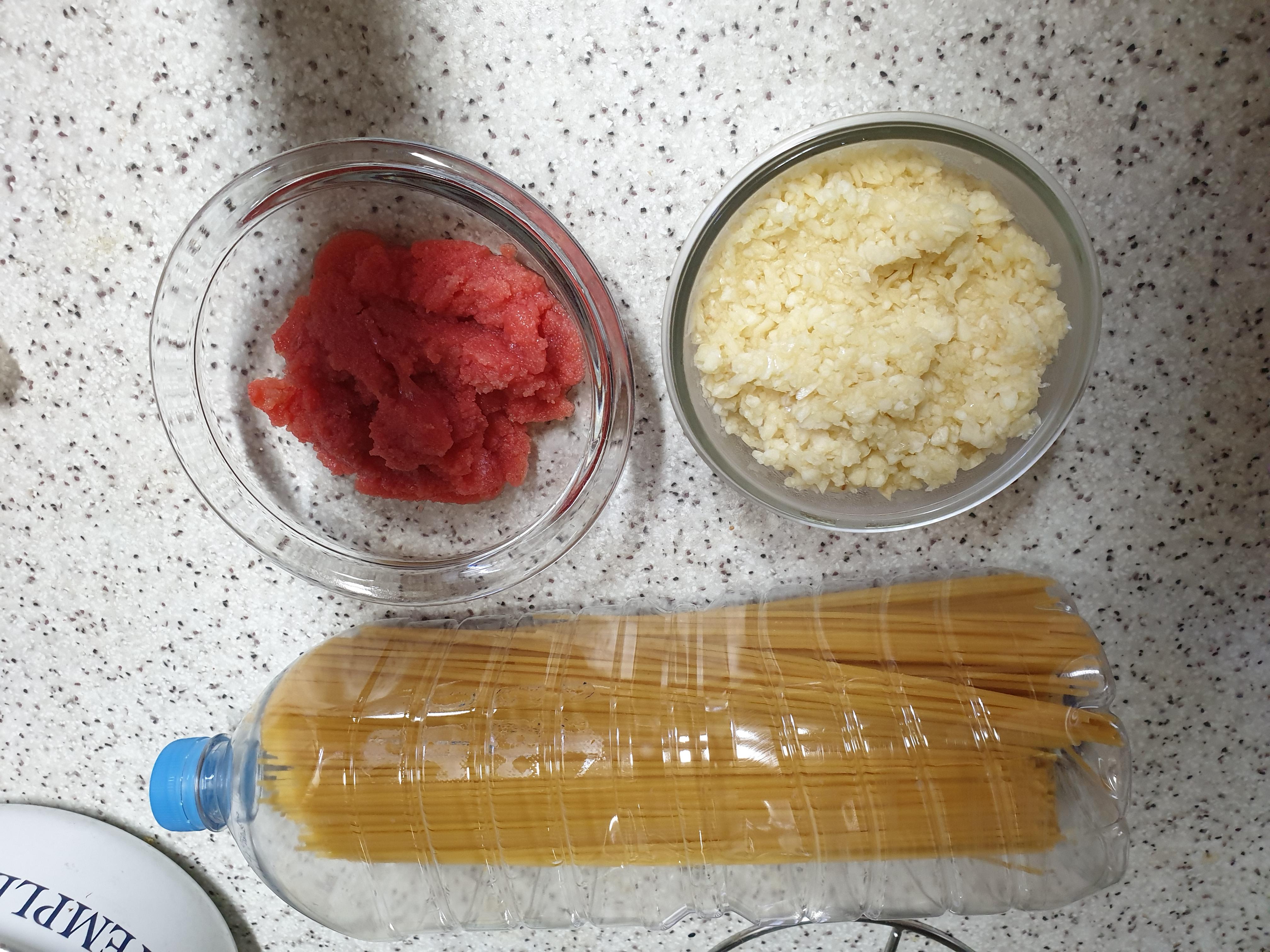 스파게티 면, 빻은 마늘 (혹은 다진 마늘), 명란 입니다.