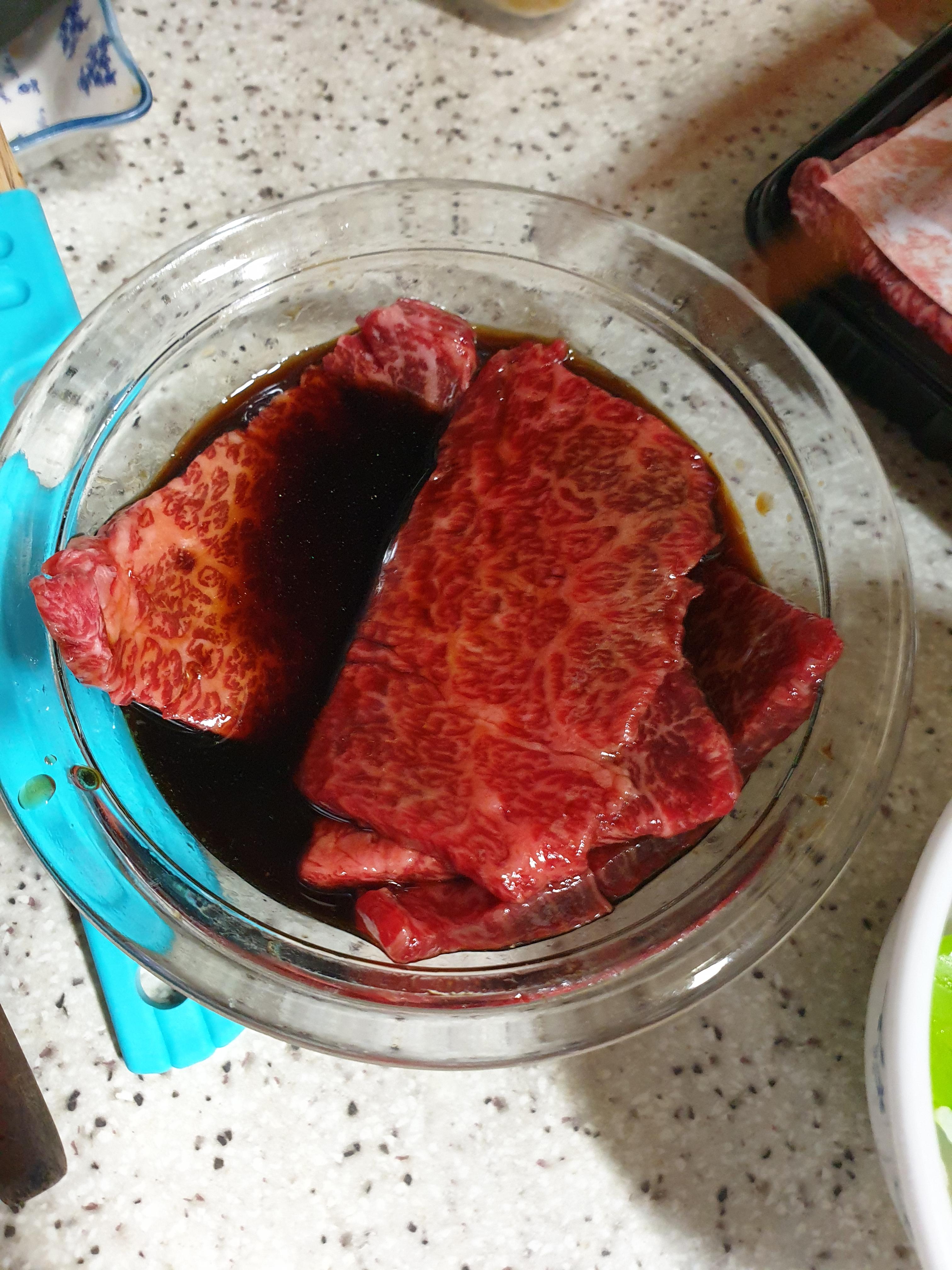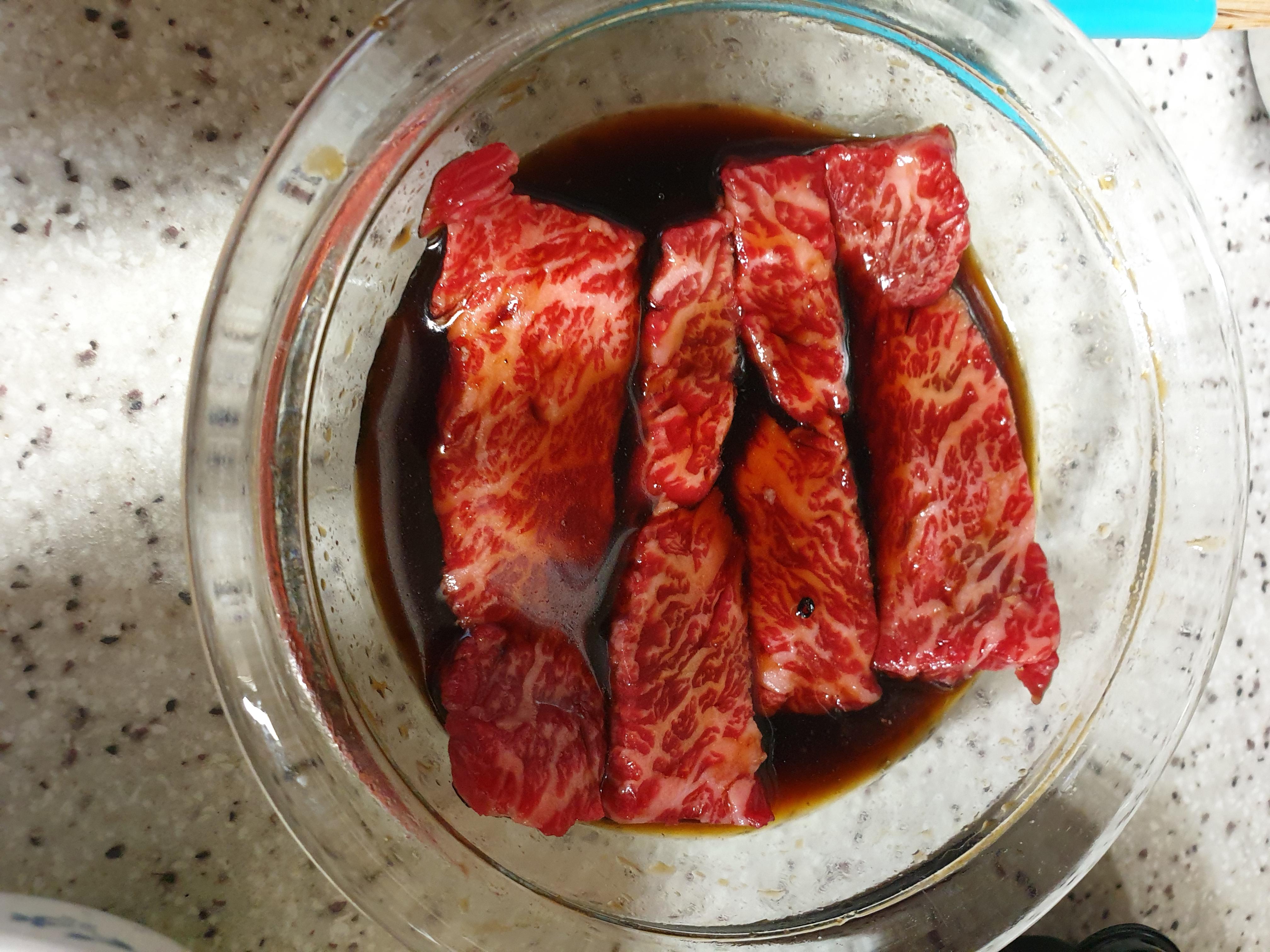 이런 식으로 고기를 푹 담가놨다가 빼서 바로 구워보았습니다.