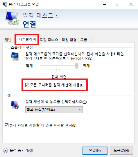 3. 디스플레이 -> '모든 모니터를 원격 세션에 사용' 옵션 체크