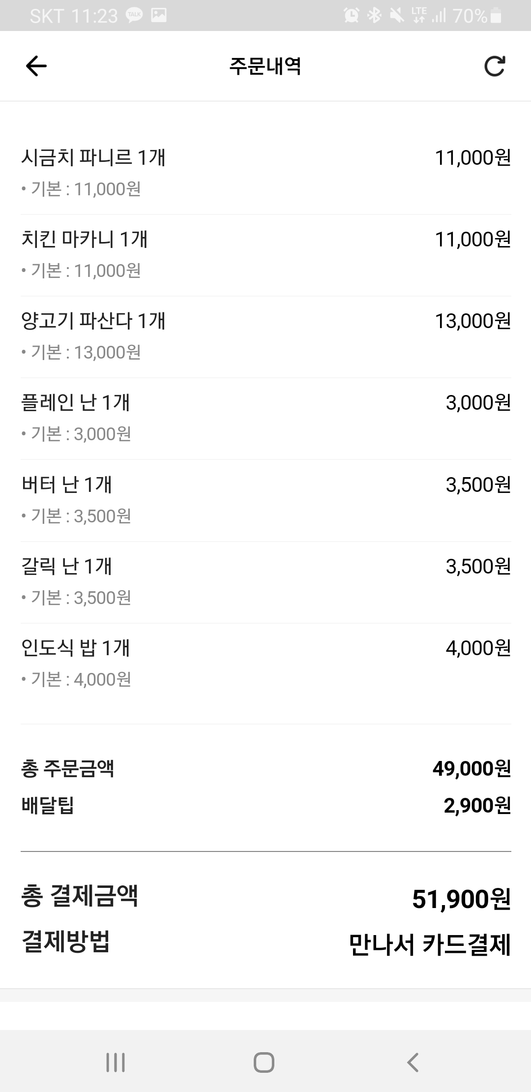 난은 플레인, 갈릭, 버터 3종류를 주문 하였습니다.