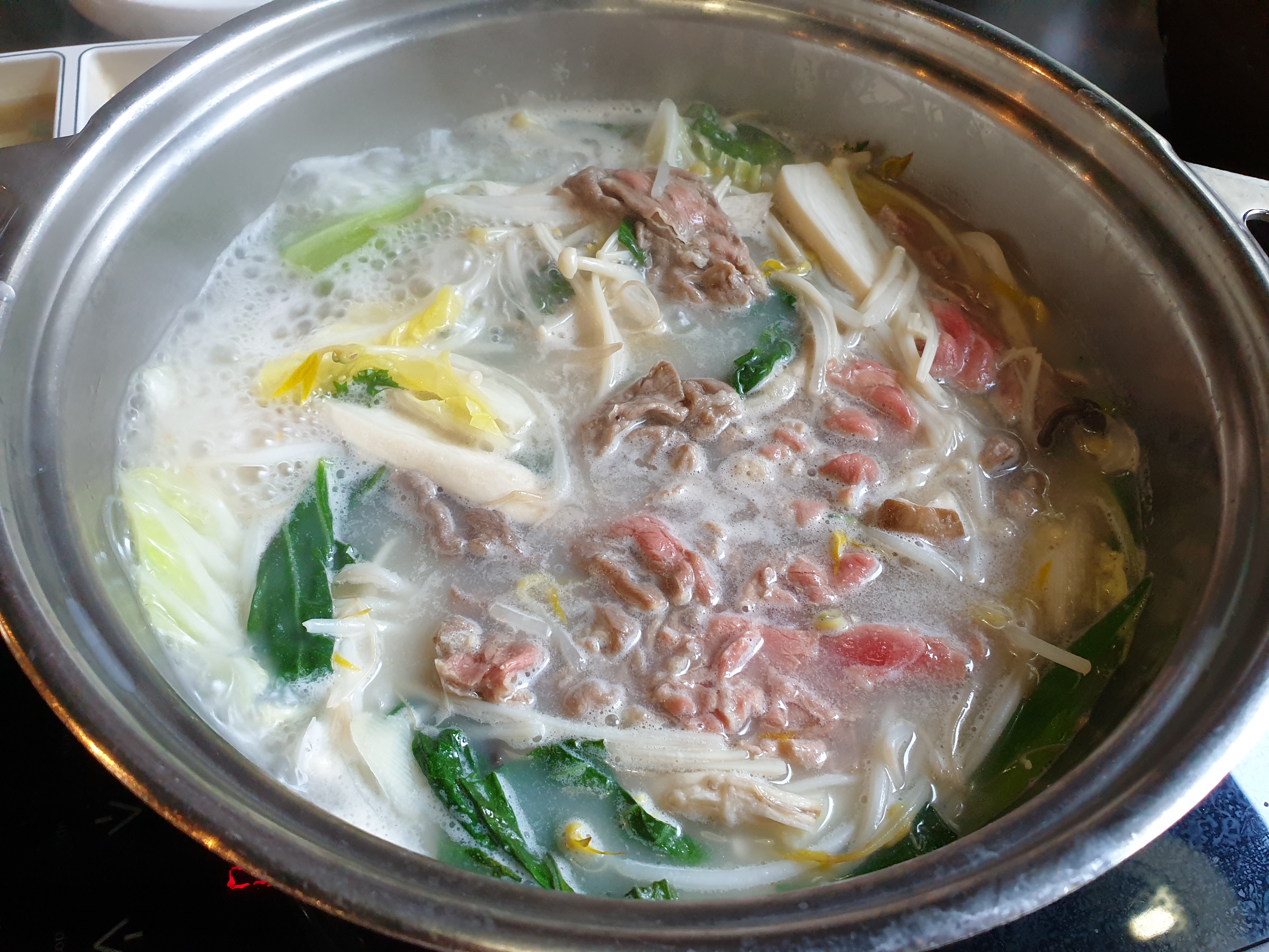 뽀얀 육수와 김치, 그리고 샤브샤브 등심과 야채가 나옵니다.