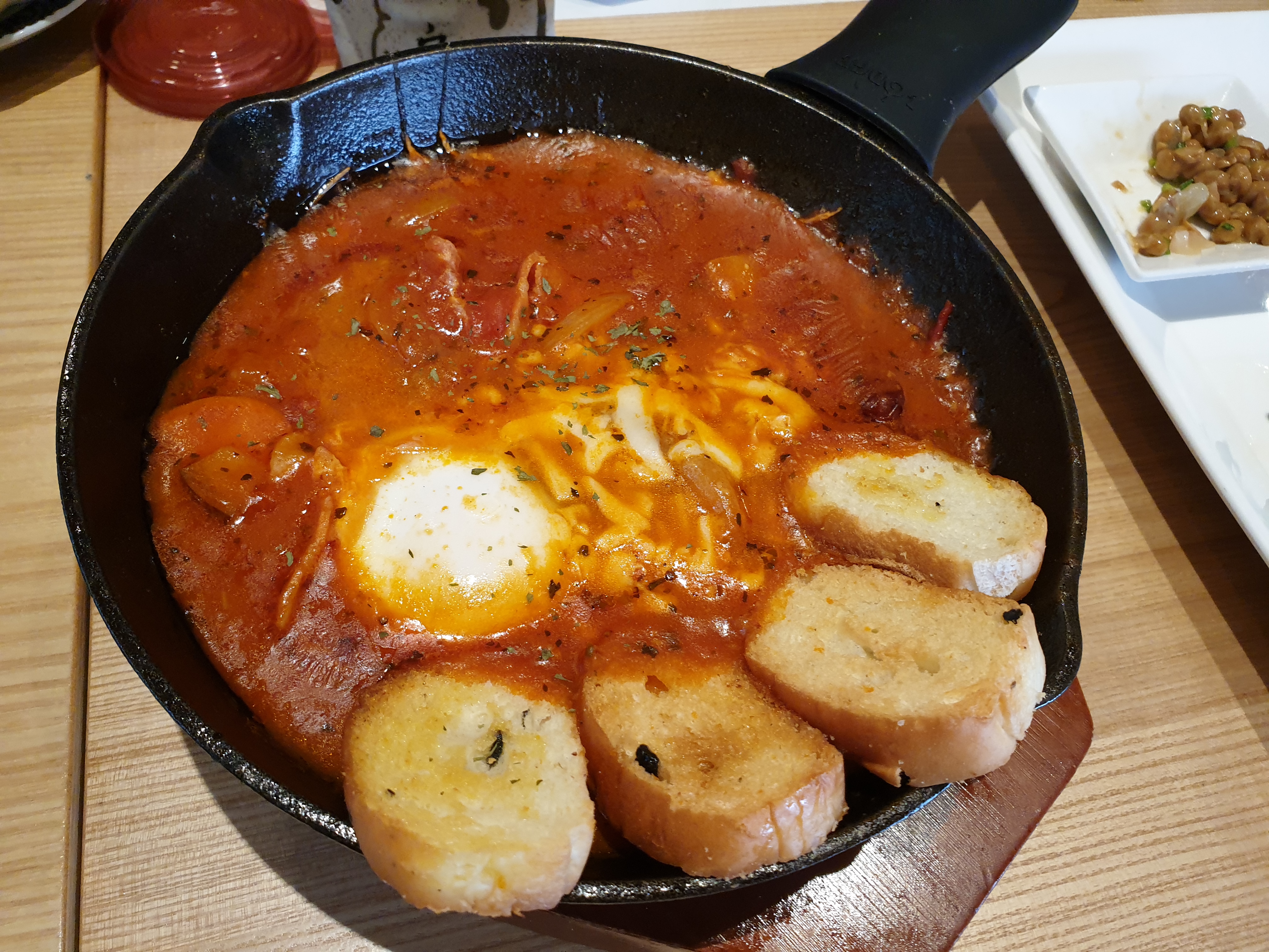 함박스테이크가 토마토 소스와 함께 나오고 반숙 달걀과 마늘 바게트가 함께 나옵니다.