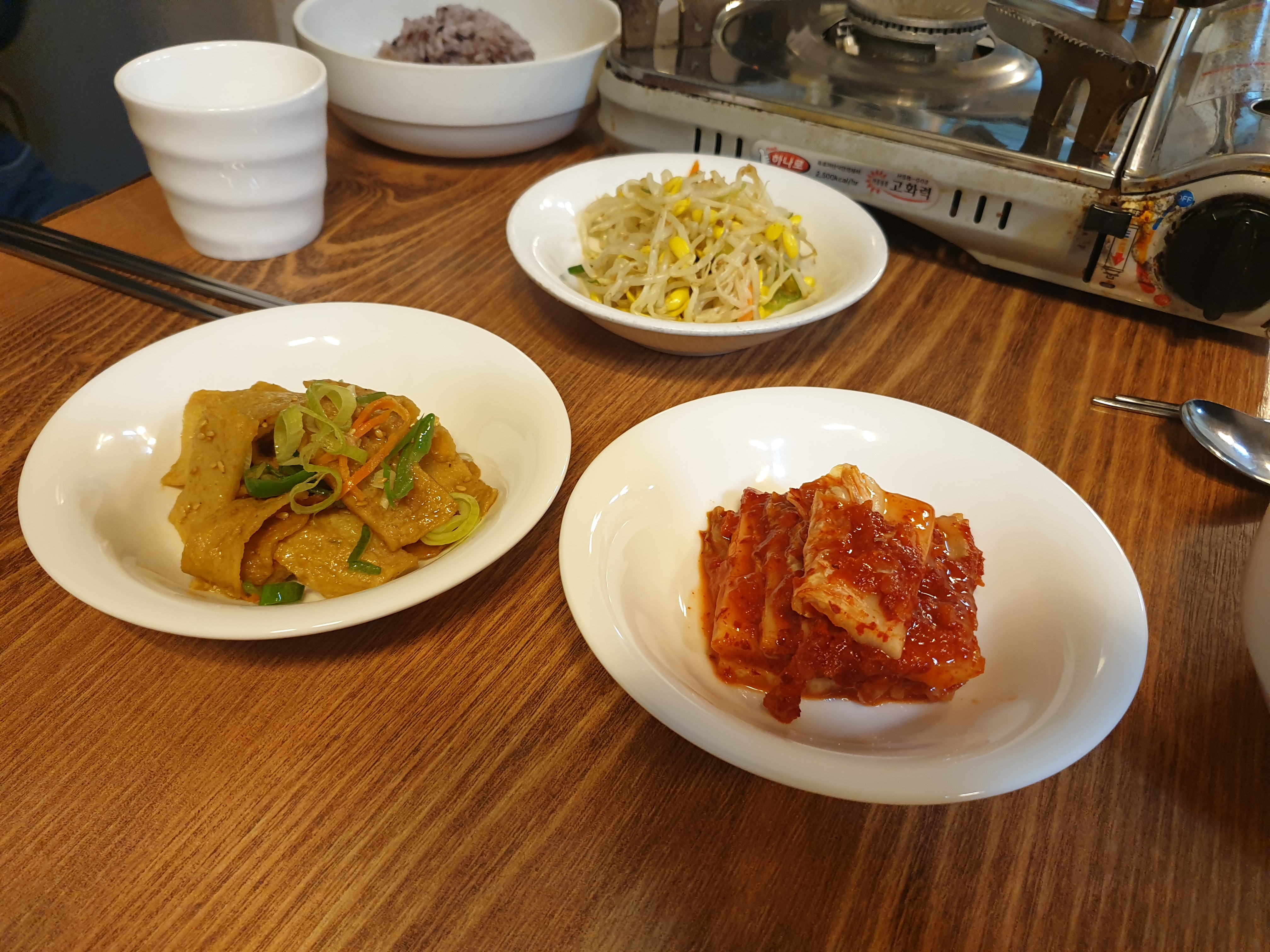 반찬은 김치, 콩나물 무침, 어묵볶음 딱 세 가지 입니다.
