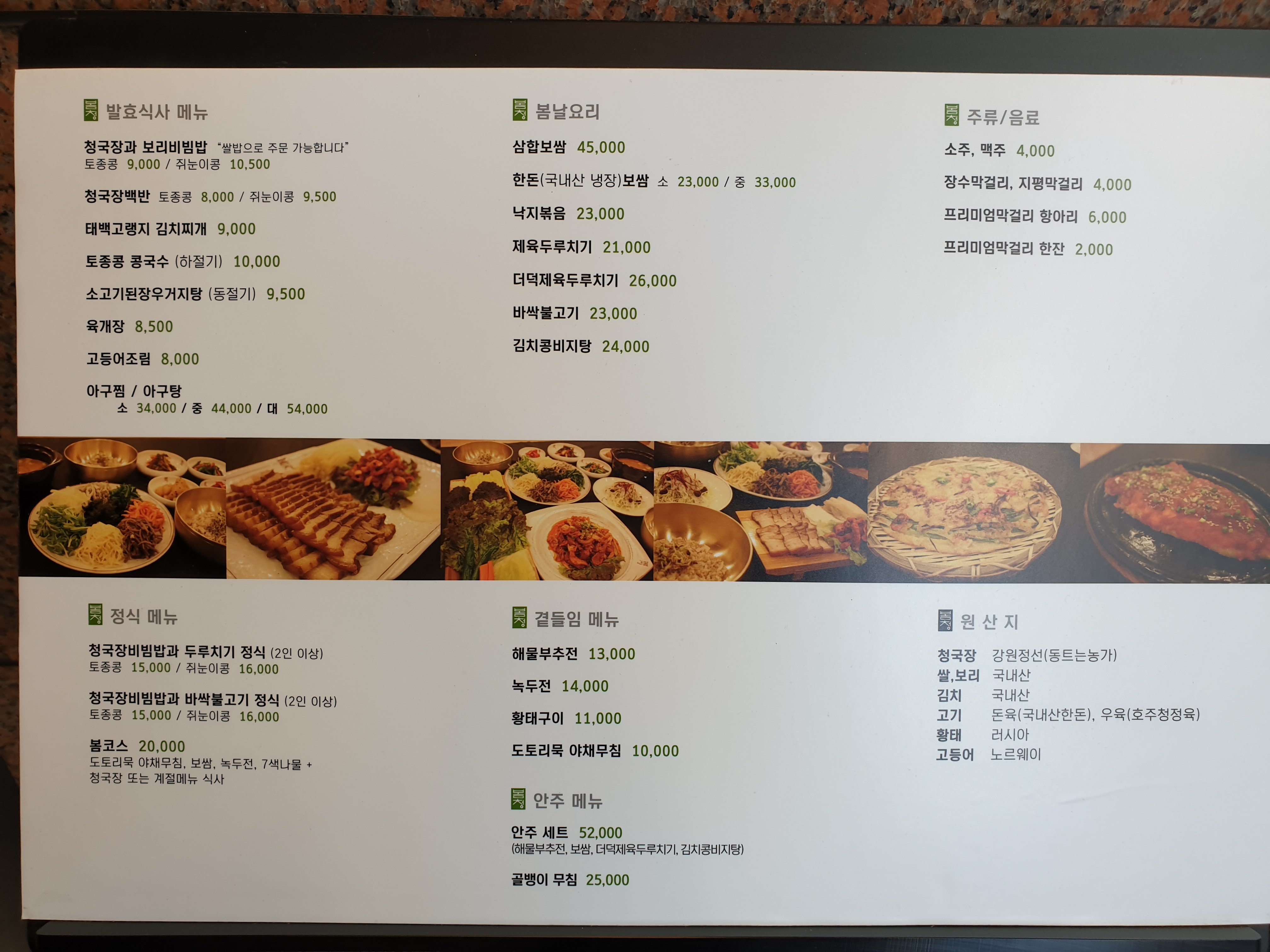 저희는 4명이서 가서 9500원 짜리 쥐눈이콩 청국장 백반 2개와 10500원 짜리 쥐눈이콩 청국장 보리밥 백반 2개를 주문 하였습니다.